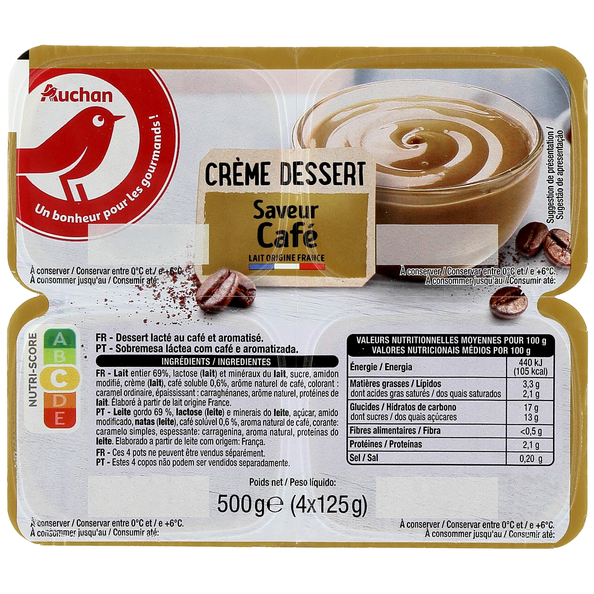 Ingrédients : LAIT entier 69%, lactose (LAIT) et minéraux du LAIT, sucre, amidon modifié, crème (LAIT), café soluble 0,6%, arôme naturel de café, colorant : caramel ordinaire, épaississant : carraghénanes, arôme naturel, protéines de LAIT. Elaboré à partir de lait origine France.