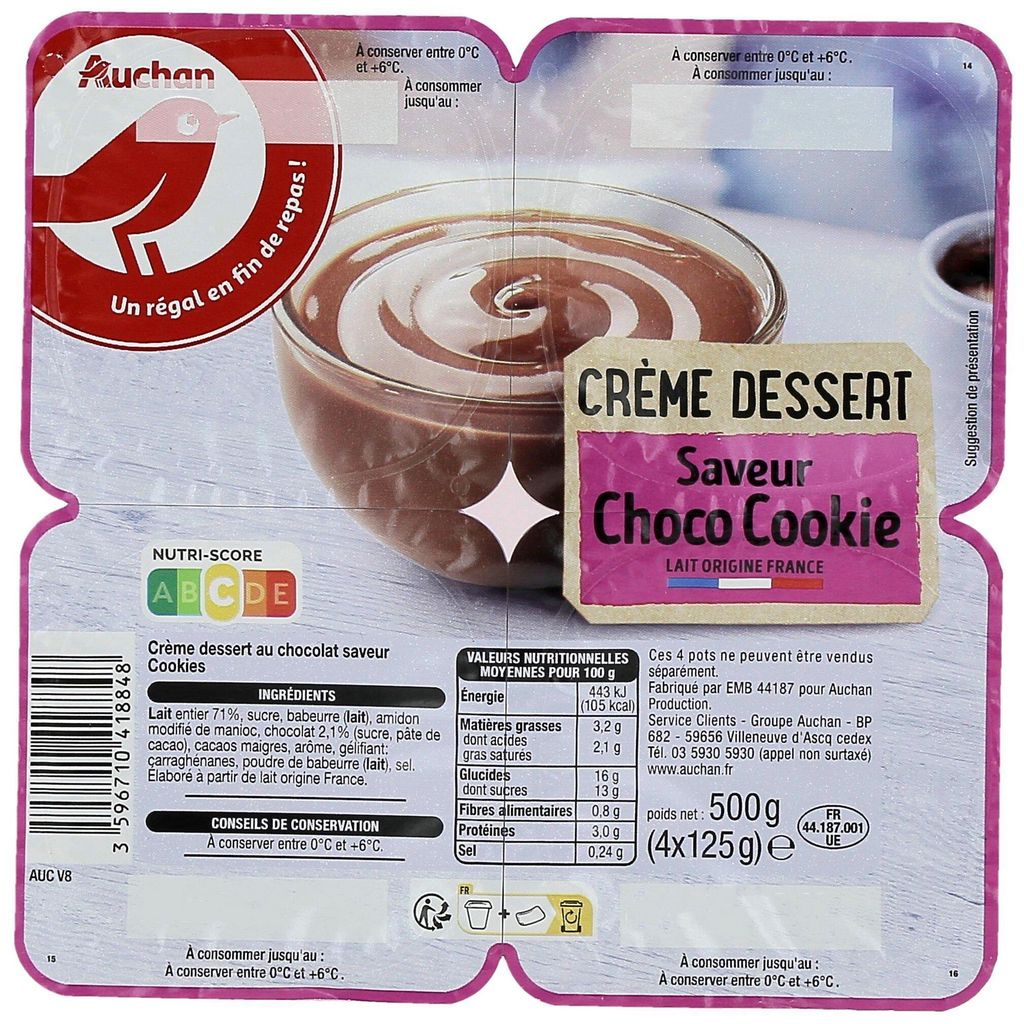 Ingrédients : LAIT entier (71%), sucre, babeurre (LAIT), amidon modifié de manioc, chocolat (2,1%) (sucre, pâte de cacao), cacaos maigres, arôme, gélifiant : carraghénanes, poudre de babeurre (LAIT), sel Elaboré à partir de lait origine France