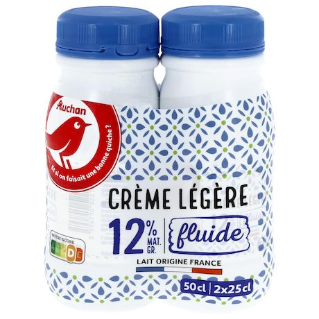Une crème, à base de lait collecté en France, conditionnée en France, fluide, légère avec 12% de matières grasses, en petites bouteilles 2x25cl