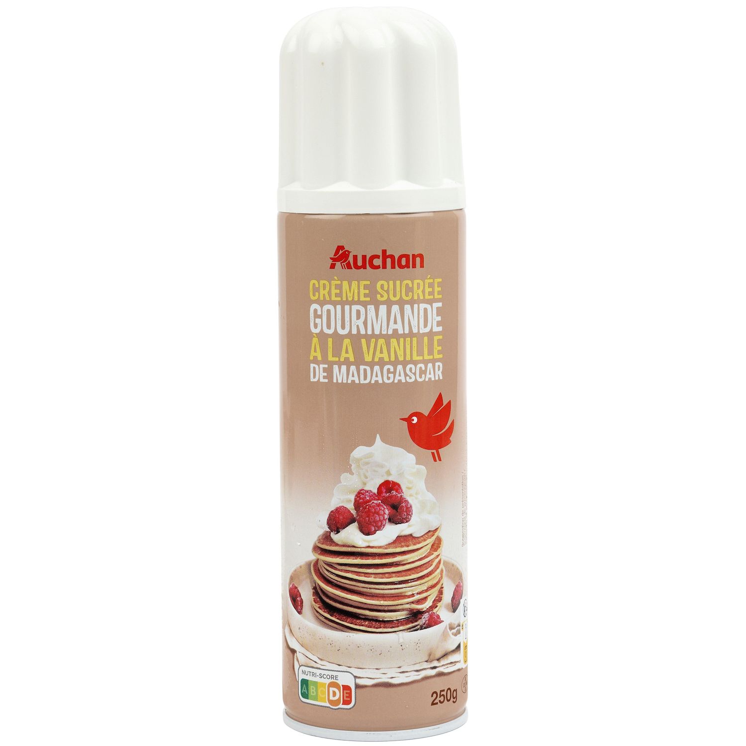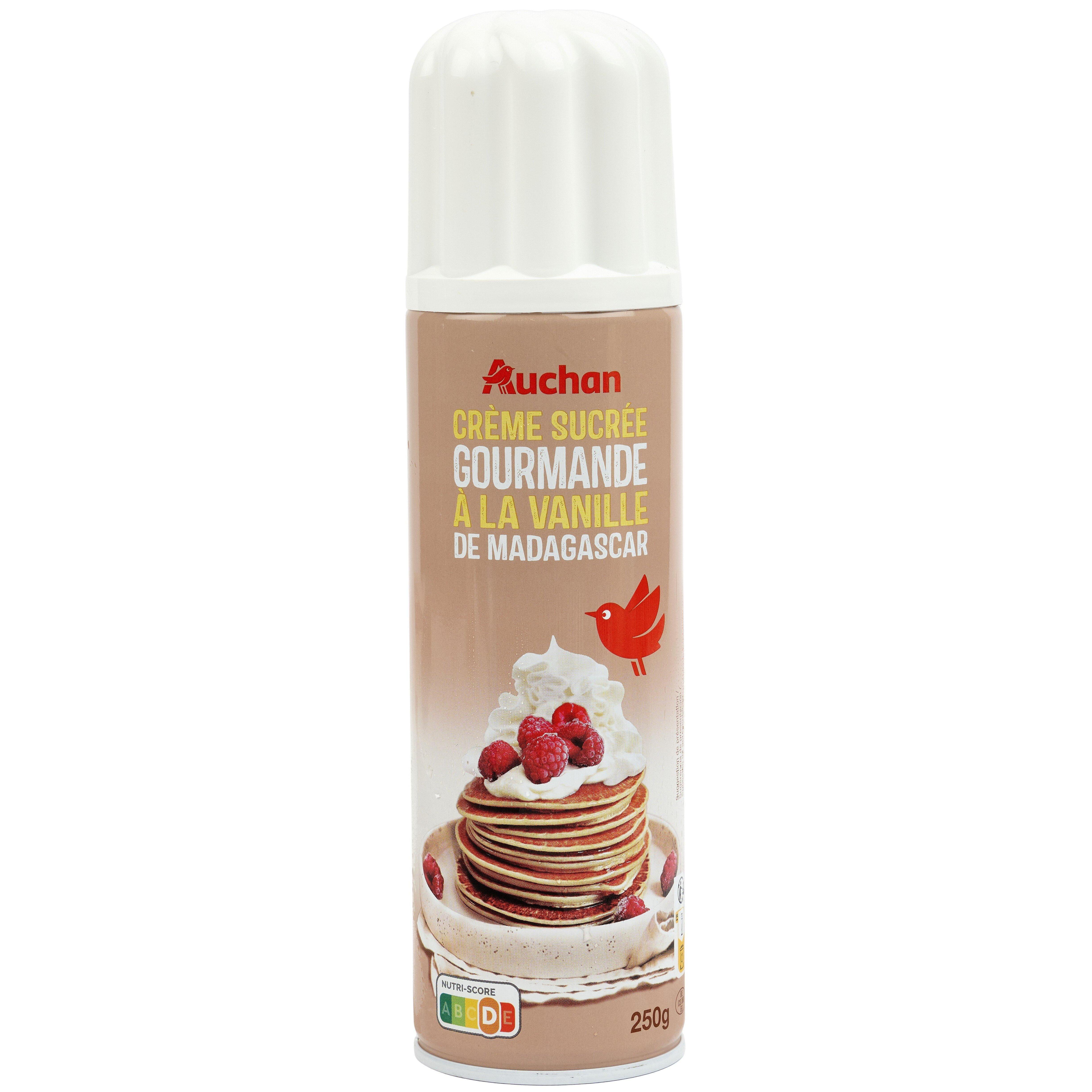 Ingrédients : Crème de LAIT à 34% de matière grasse (91%), sucre (8,5%), émulsifiant : mono- et diglycérides d'acides gras, arôme naturel de vanille de Madagascar, stabilisant : carraghénanes. Gaz propulseur : protoxyde d’azote. Elaboré à partir de lait origine UE.