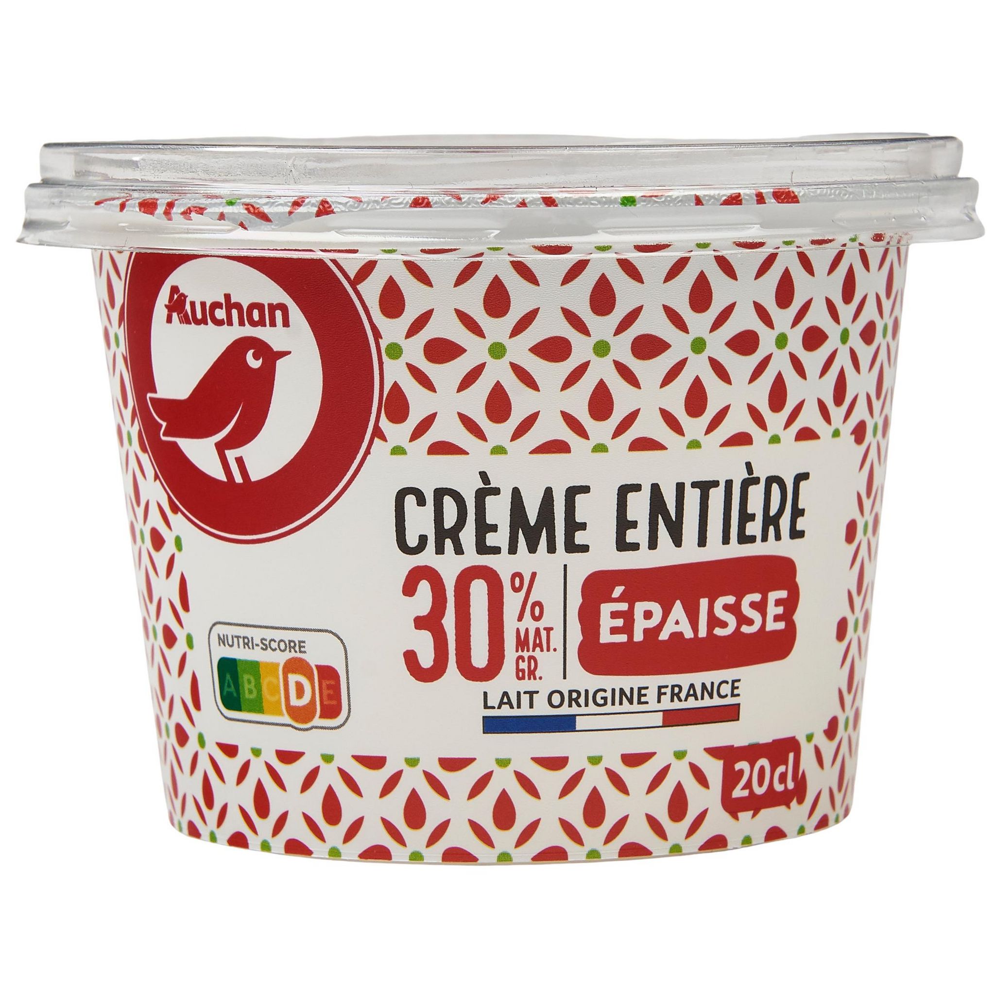 Une crème, à base de lait collecté en France, conditionnée en France, épaisse, entière avec 30% de matières grasses, dans un pot 20cl