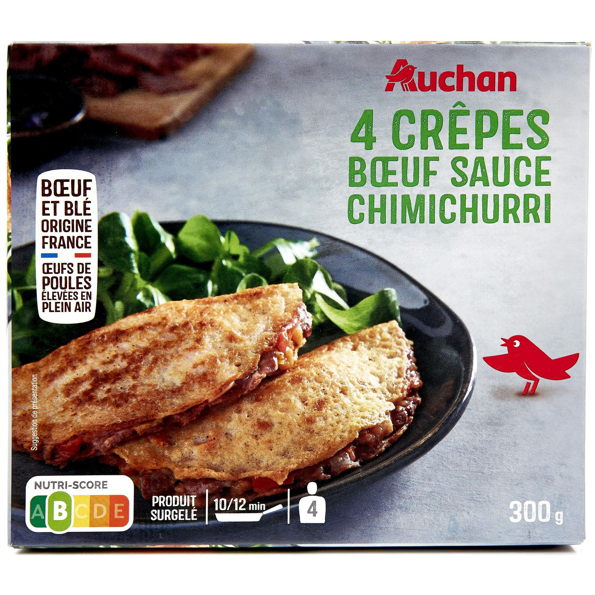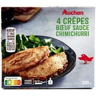 Crêpe (48%) garnie d'une préparation à base de tomates, bœuf fumé cuit et mélange chimichurri, surgelée.