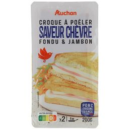 Ingrédients : Pain de mie 53,4% (farine de BLÉ, eau, levure, huile de colza, gluten de BLÉ, sucre, sel, agent de traitement de la farine : acide ascorbique), fromage de chèvre fondu 23,7% (LAIT) (fromage de chèvre 11,8%, fromages, eau, beurre, amidons modifiés, protéines de lait, sels de fonte : citrate de sodium polyphosphates, lait écrémé en poudre, lactosérum, gélifiant : carraghénanes, arôme), jambon cuit standard 17,8% (jambon de porc, eau, dextrose, sel, arômes naturels, stabilisant : diphosphates, antioxydant : ascorbate de sodium, conservateur : nitrite de sodium), huile végétale raffinée (colza), beurre concentré (LAIT). Pourcentages exprimés sur le total de la recette. Élaboré à partir de porc origine France et de lait origine UE ou hors UE. Traces éventuelles d'œufs, poissons, mollusques, crustacés, céleri, moutarde, soja et fruits à coque.