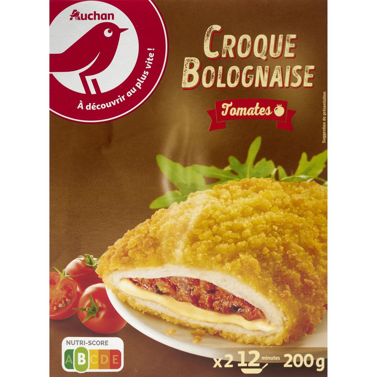 Ingrédients : Viande de filets de poulet reconstitués traités en salaison : 62% (viande de filets de poulet : 46.5%, eau, fibres de BLÉ, dextrose de blé, sel), panure : 17% (eau, farine de BLÉ, sel, levure, épices), sauce bolognaise: 13% (tomate pelée concassée et jus de tomate : 6.1%, purée de tomate : 2.3%, viande de dinde : 1.7%, oignon, eau, amidon modifié de manioc, aromates, huile d’olive vierge extra, sel, épaississants : gomme xanthane et de guar, épices), fromage fondu : 8% (fromages (dont LAIT), eau, amidons modifiés, beurre (dont LAIT), LAIT écrémé en poudre, lactosérum (dont LAIT), sel de fonte : citrates de sodium, gélifiant : carraghénanes). Friture à l’huile de tournesol. Elaboré à partir de poulet, dinde et lait origine UE.