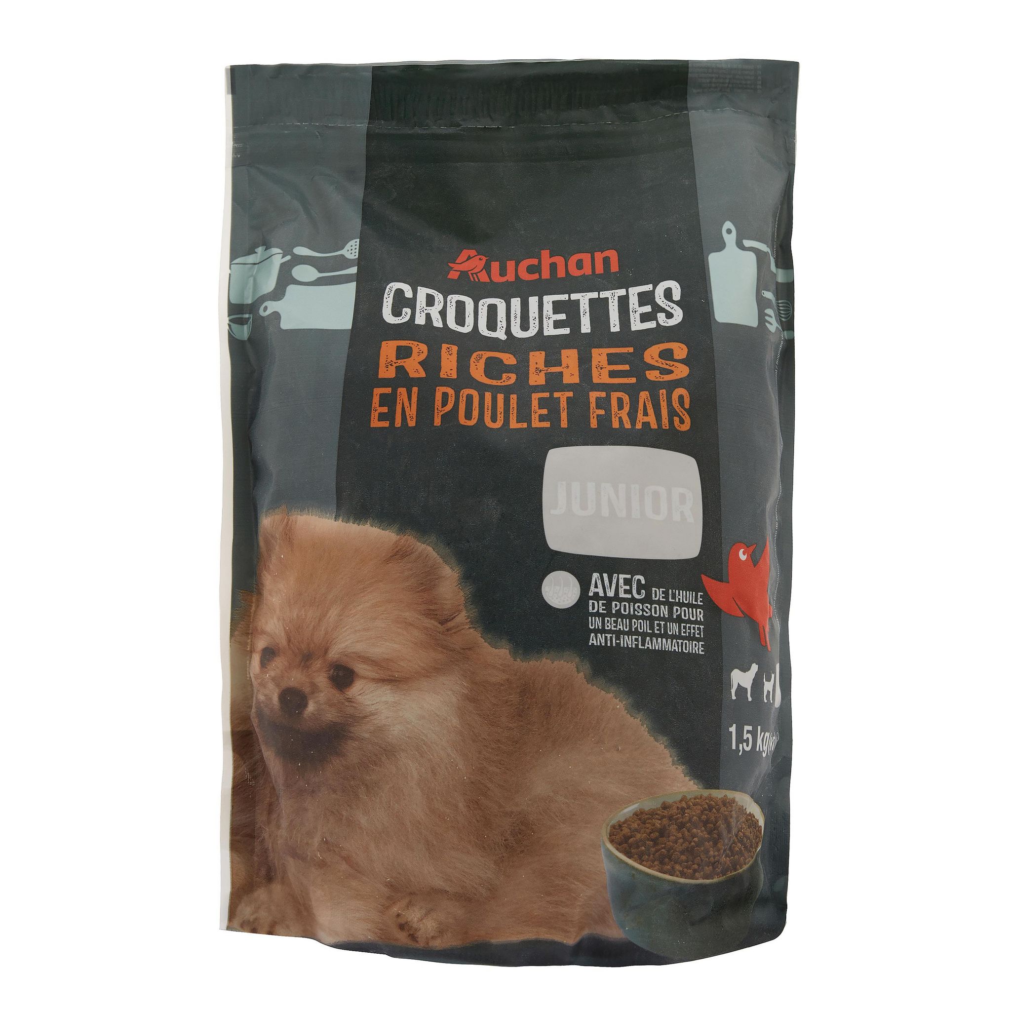 repas 100% complet pour chiot composé de poulet frais sans colorant , conservateurs et aromes artificiels ajoutés developpé en collaboration avec un vétérinaire avec de l'huile de poisson pour un beau poil et effet anti inflamatoire. La taille de la croquette est adaptée à la machoire des chiots