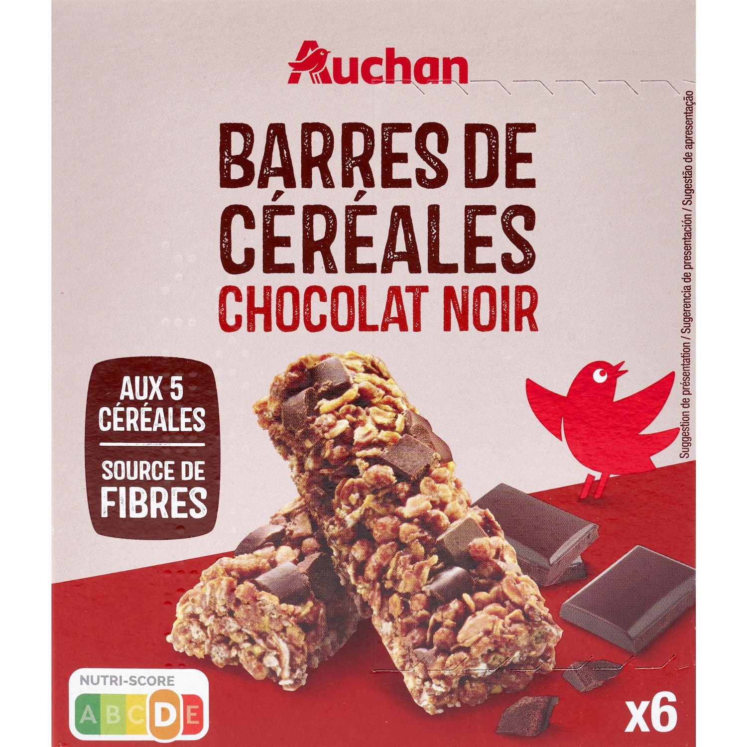 Ingrédients : Sirop de glucose, céréales croustillantes (farine de BLÉ 9,5%, farine de riz 4%, dextrose, sucre, sel), morceaux de chocolat noir 12% (pâte de cacao, sucre, beurre de cacao), flocons d'AVOINE 11,5%, pétales de maïs 7% (maïs, extrait de malt d'ORGE, sel), flocons de SEIGLE 7%, granulés de chocolat noir 6% (sucre, pâte de cacao, beurre de cacao, émulsifiant: lécithines (SOJA), arôme naturel de vanille), huile de tournesol, chocolat noir rapé 3,5% (pâte de cacao, sucre, cacao maigre en poudre), stabilisant: sorbitols, émulsifiant: lécithines (SOJA), antioxydant: extrait riche en tocophérols, arôme naturel. Traces éventuelles de lait, d'arachides et des fruits à coque.
