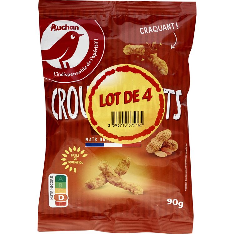Ingrédients : Semoule de maïs 66%, cacahuètes (ARACHIDES) grillées moulues 34%, huile de colza, sel, arômes naturels, farine de riz, fibre de pomme de terre. Traces éventuelles de céréales contenant du gluten, crustacés et lait. Elaboré à partir de maïs origine France.