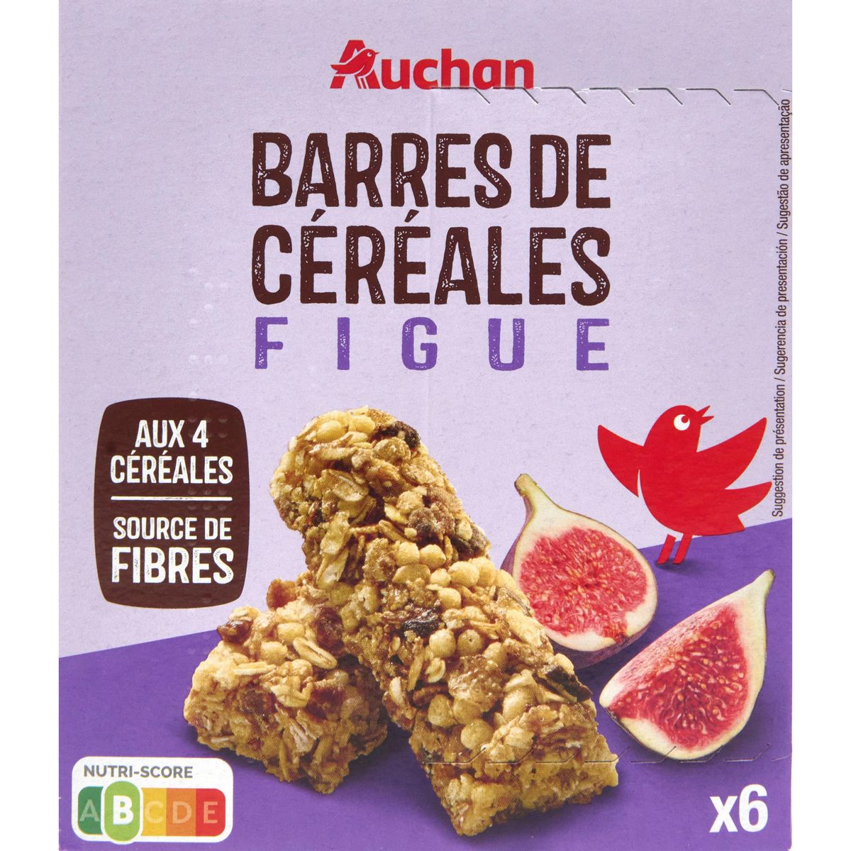Ingrédients : Sirop de glucose, figue deshydratée 17% (figue, dextrose), flocons d'AVOINE 12%, pétales de BLÉ complet 12% (BLÉ complet, extrait de malt d'ORGE, sel), flocons de SEIGLE 10,5%, céréales croustillantes (farine de BLÉ 5,5%, farine de riz 2%, dextrose, sucre, sel), huile de tournesol, fructooligosaccharides, stabilisant: sorbitols, arôme naturel de figue, colorant: caramel ordinaire, émulsifiant: lécithines (SOJA), antioxydant: extrait riche en tocophérols. Traces éventuelles de lait, d'arachides et de fruits à coque