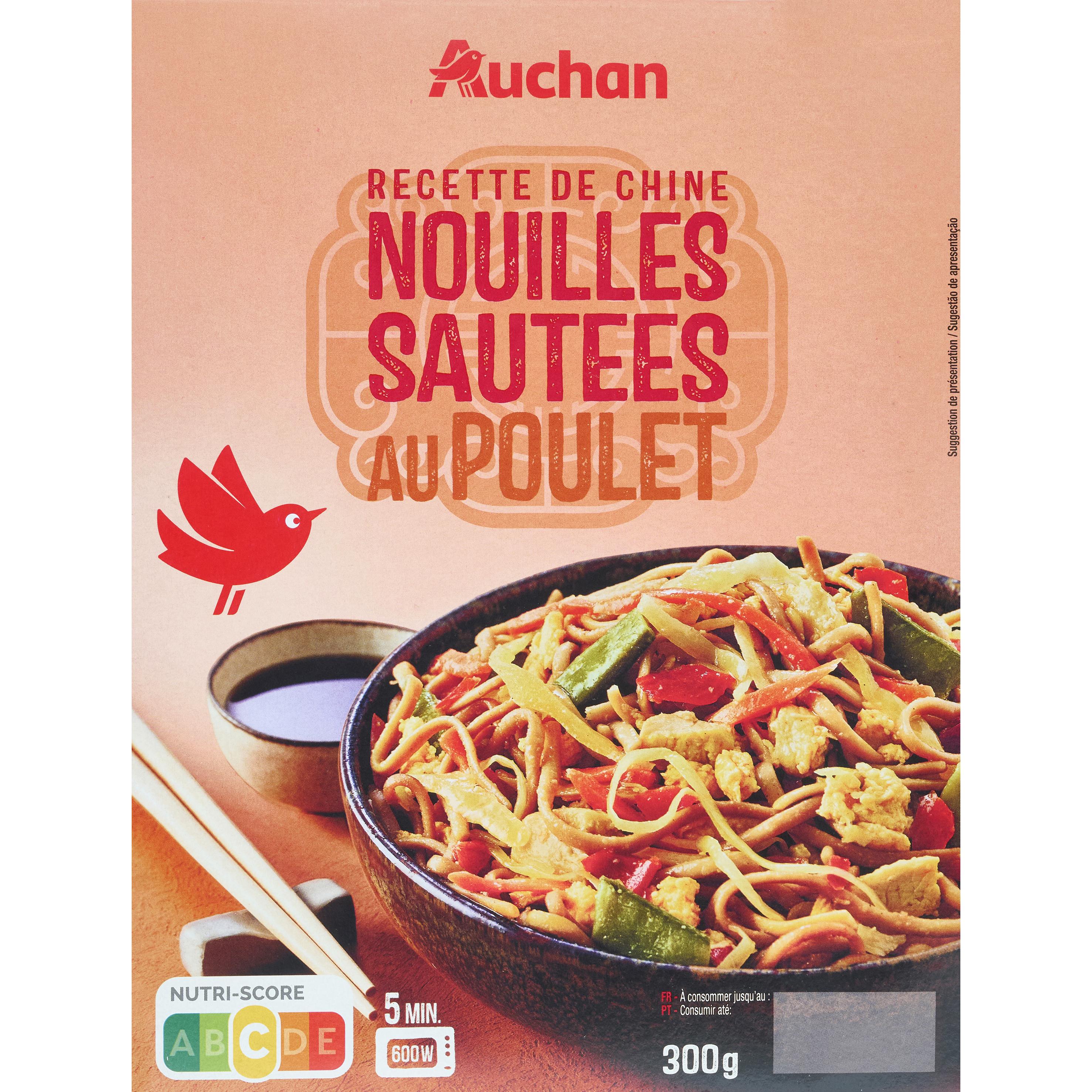 Ingrédients : Nouilles cuites 47, 1% (eau, semoule de BLÉ dur, farine de BLÉ tendre, sel, huile de soja entièrement raffinée), choux blancs12%, filet de poulet 8, 5% (origine: UE), OEUFS 8, 1%, pois mange tout 5%, oignons 4, 5%, carottes 3%, poivrons rouges 3%, huile de soja entièrement raffinée, sauce soja 2, 1% (eau, graines de SOJA, sel, sucre, farine de BLÉ), sauce poisson (extrait d'anchois (POISSON), sel, sucre), sucre, ail, fécule de pommes de terre,huile de tournesol, sel, poivre blanc, extrait de levure, colorant: caroténoïdes, émulsifiant: sucroestersd'acides gras.Traces éventuelles de crustacés, arachides, lait, fruits à coque, céleri, moutarde, graines de sésame etmollusques.Pourcentage exprimés sur le total de la recette.