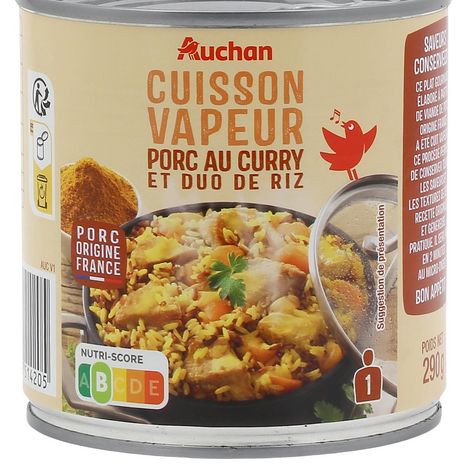 Ingrédients : Viande de porc traitée en salaison et précuite 27% (viande de porc, eau, amidon de pois, sel), riz précuit 23%, carottes 16%, eau, riz rouge précuit 9,5%, huile de colza, curry 1% (mélange d'épices, sel), crème de coco en poudre (contient : maltodextrine, caséinate de sodium (LAIT)), sel, ail , sucre, curcuma, arôme naturel d'épices, amidon de manioc, gingembre. Elaboré à partir de viande de porc origine France. Pourcentages exprimés par rapport au poids net total.