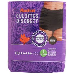 Culotte Discreet Taille L NoirAvec leur touche féminine, ces culottes discreet vous apportent protection, confort et discrétion. Elles s'adaptent parfaitement à votre morphologie et toutes les matières en contact avec la peau sont testées dermatologiquementCet emballage contient au moins 30% de plastique recycléTriple protection : contrôle des odeurs, protection anti-fuites, protection contre l'humiditéVoile de surface ultra douxCoeur et canaux absorbantsDouble barrière anti-fuites