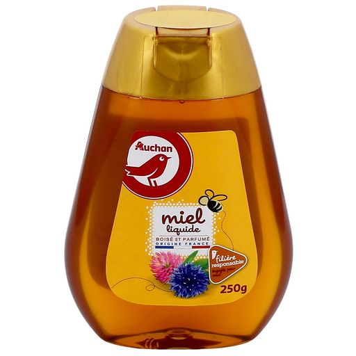 Miel Auchan. Origine 100% France. Une filière responsable sur tous les plans : Environnemental : Les contrôles systématiques avant conditionnement assurent que le Miel Auchan ne contient pas de résidus de pesticides ni d'antibiotiques. Il n'y a pas de traitement chimique sur les ruches (peintu