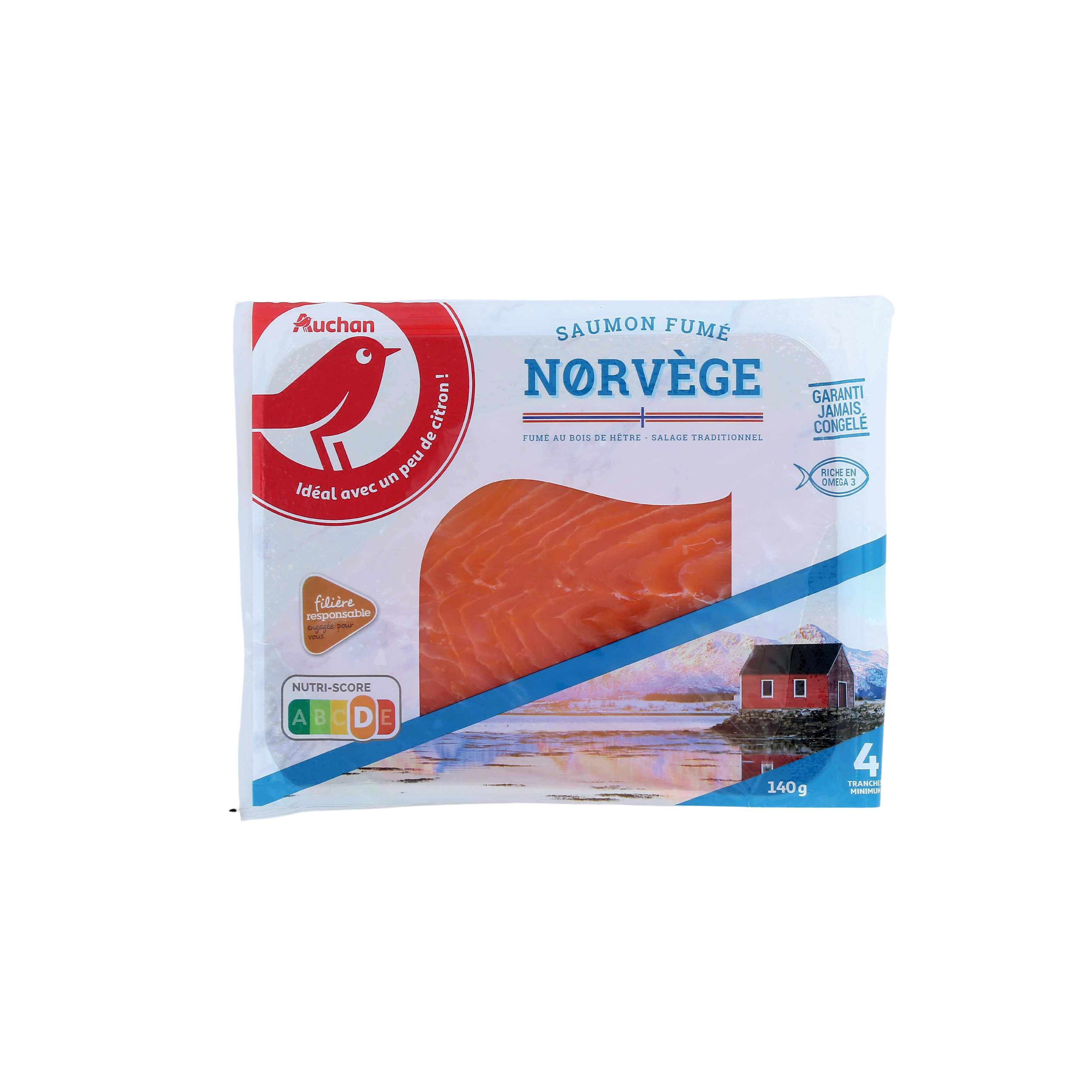 Utilisation pour le fumage de sciure de bois de hêtre issus de forêt gérées durablement (certification PEFC). C’est un saumon qualitatif béneficiant d’un salage traditionnel, au sel sec. Il est riche en oméga 3 mais son taux de matière grasse est faible (<18%).
