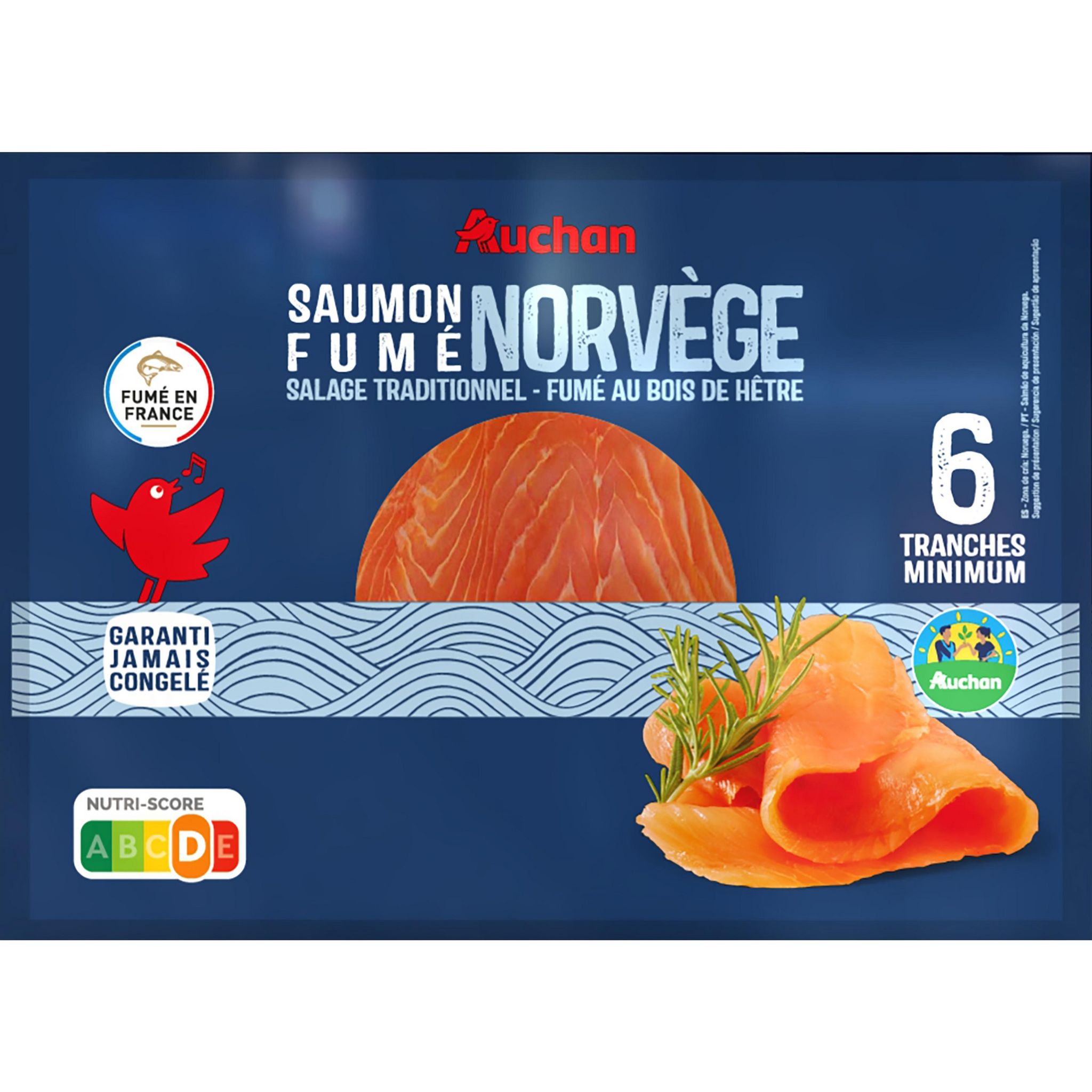 Le label "filière responsable" offre la garantie de produits élaborés dans le plus grand respect des hommes, des poissons et de l'environnement.Il garantit une parfaite traçabilité, de la mer à l'assiette.Il symbolise la volonté d'Auchan de proposer des produits bons et sains.On vous dit tout !Ce saumon est élevé dans les eaux pures et froides des fjords norvégiens. C'est avec passion que nos partenaires filière Auchan réunissent toutes les conditions pour qu'il grandisse sainement.Son alimentation adaptée et sans OGM (<0.9%), sa densité d'élevage limitée, le respect de son bien-être, le contrôle et la qualité des fonds marins, permettent d'obtenir un saumon bon et sain.Préparés dans nos ateliers français, les filets sont salés traditionnellement au sel sec, puis délicatement fumés au bois de hêtre.Garanti jamais congelé, délicieusement fondant, au goût équilibré, ce saumon fumé satisfera vos papilles.