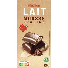 Tablette de chocolat au lait fourrée mousse praliné Auchan, fabriquée en France. Auchan soutient le programme transparence cacao en privilégiant un cacao issu d'une culture durable. Avec la filière Responsable, Auchan s'engage dans une démarche durable et respectueuse de la biodiversité. Les res
