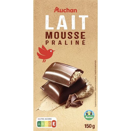 Tablette de chocolat au lait fourrée mousse praliné Auchan, fabriquée en France.