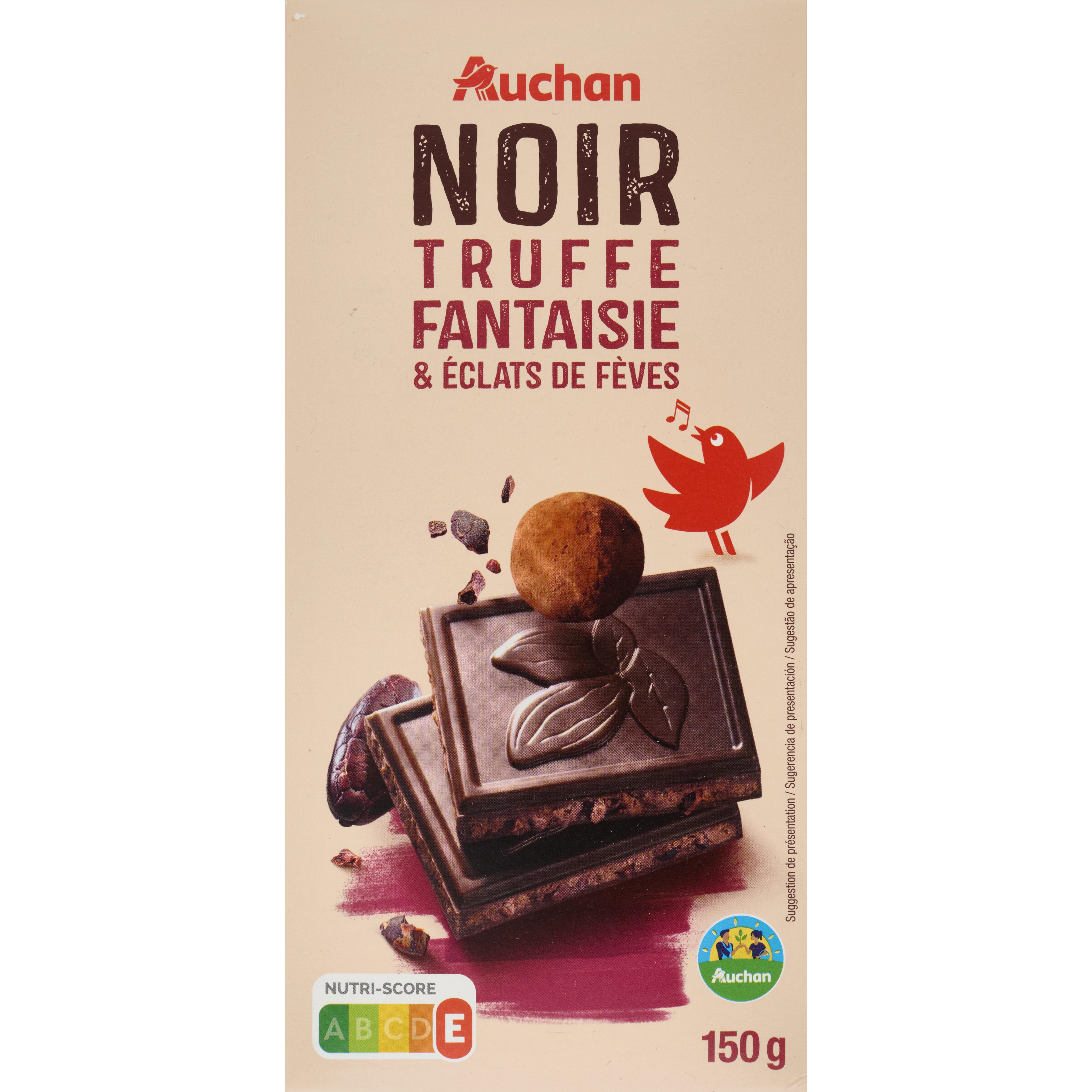 Tablette de chocolat noir truffe fantaisie et éclats de fèves Auchan Gourmet, fabriquée en France.