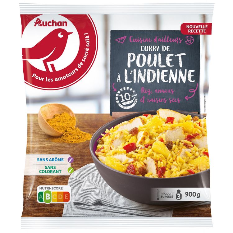 Ingrédients : riz blanc 54.8% (eau, riz), viande de poulet rôti traité en salaison 15% (filet de poulet 14,4%, amidon, sel, dextrose), ananas 7%, pommes 6% (pomme, antioxydant : acide ascorbique, correcteur d'acidité : acide citrique, sel), poivron rouge 6%, tomates 6%, raisins secs 2% (raisins, huile de coton), huile de colza, bouillon de poulet (sel, sirop de glucose, sucre, viande de poulet déshydratée, huile de tournesol, légumesen poudre (oignons, poireaux), épices), coriandre, sel, sucre, curcuma, cumin en poudre, fenugrec, poudre d'oignon, cannelle, ail, poudre de piment, gingembre,clou de girofle. Elaboré à partir de poulet origine Brésil