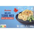 Ingrédients : Portions de bloc de filets de colin d'Alaska* (POISSON)( Theragra chalcogramma ) 41%, chair de lieu noir* (POISSON)( Pollachius virens ) 13,6%, crème fraîche (LAIT) (crème pasteurisée, ferments lactiques), oignons, chorizo 6,5% (viande et gras de porc, piments, sel, dextrose, ail, origan, extrait d'épice, ferments), courgette, huile de tournesol, crumble (farine de BLÉ, emmental (LAIT de vache pasteurisé, sel, ferments lactiques), huile de tournesol, sel), blanc d'OEUF, eau, échalotte, Parmigiano Reggiano (LAIT, sel, présure), huile d'olive, sel, jus de citron, amidon de maïs, piment d'Espelette, poivre. Traces éventuelles de céleri *Malgré tout le soin apporté à la préparation de nos produits, la présence d'arrêtes n'est jamais exclue.