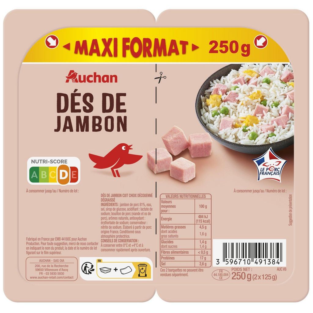 Ingrédients : Jambon de porc 81%, eau, sel, sirop de glucose, acidifiant : lactate de sodium bouillon de porc (viande et os de porc), arômes naturels, antioxydant : érythorbate de sodium conservateur : nitrite de sodium. Elaboré à partir de porc origine France.