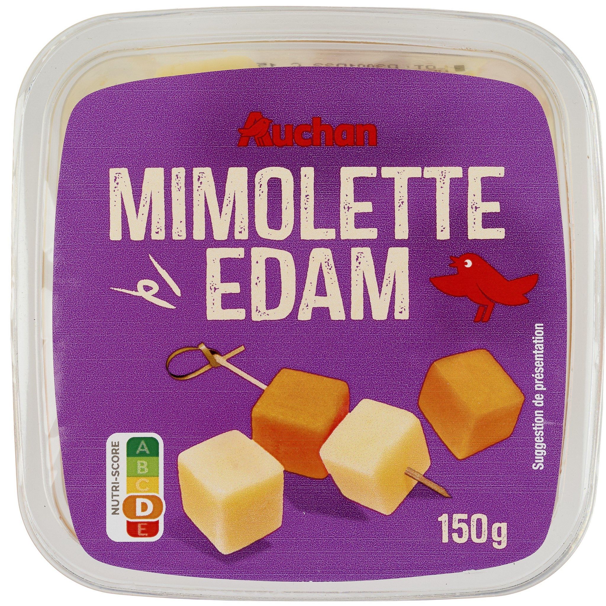 Ingrédients : Mimolette 50% : LAIT pasteurisé de vache, sel, ferments lactiques (LAIT), coagulant microbien, colorant : norbixine de rocou. Edam 50% : LAIT pasteurisé de vache, sel, ferments lactiques (LAIT), coagulant microbien. Élaboré à partir de lait origine : Pays-Bas, Allemagne et Belgique.