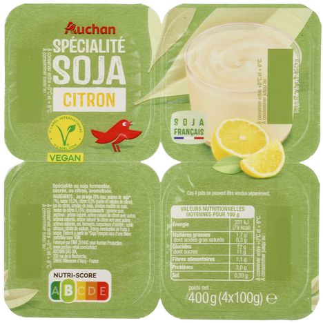Ingrédients : Jus de SOJA 76% (eau, graines de SOJA* 7%), sucre 10.3%, citron 9.5% (purée et cellules de citron), jus de citron, amidon de maïs, amidon modifié de maïs, zestes de citron 0.15%, épaississants: gomme guar, pectines arôme naturel, arôme naturel de citron avec autres arômes naturels, arôme naturel de citron vert avec autres arômes naturels, sel, ferments, correcteurs d'acidité : acide citrique, citrate de sodium. Traces éventuelles de fruits à coque. Elaboré à partir de *Soja français issu d'une filière contrôlée sans OGM.