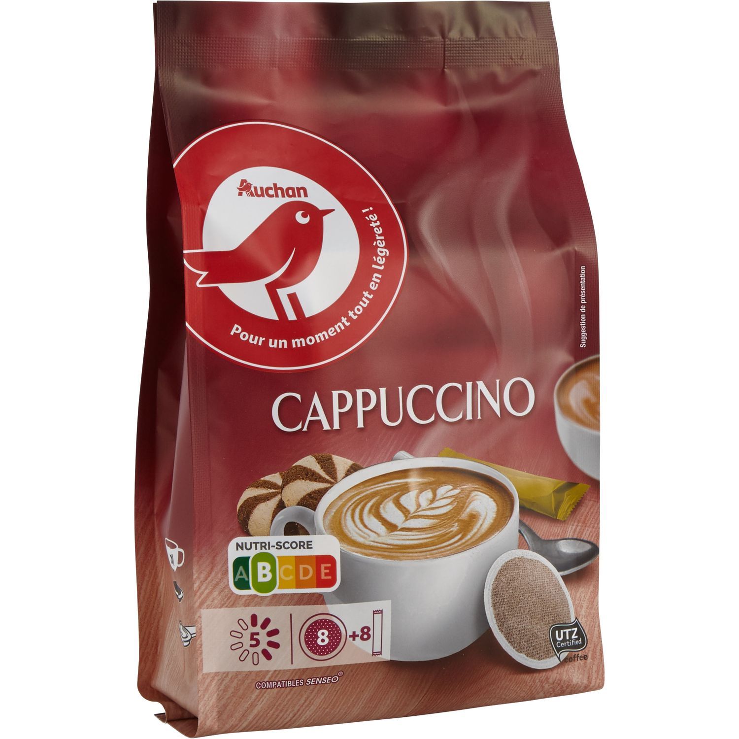 Dosettes souples de café torréfié moulu conditionnées sous atmosphère protectrice et sachets de préparation sucrée à base de lait écrémé en poudre Ce café a été cultivé par des producteurs certifiés UTZ et dont la norme est le respect des personnes, des pratiques agricoles et de la planète. www.utz.org