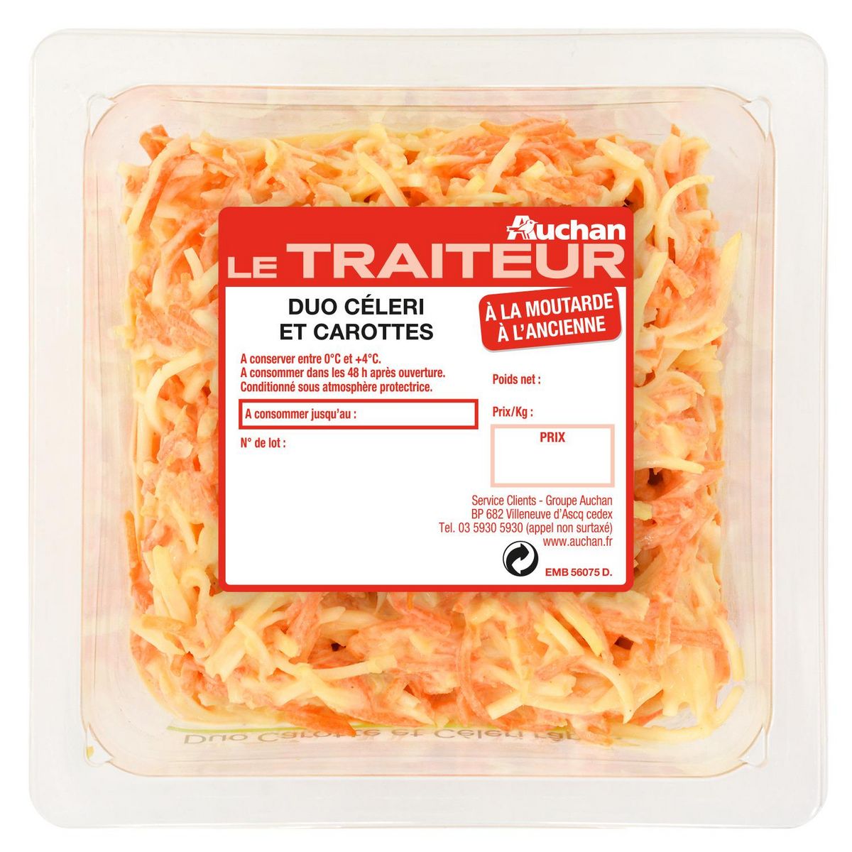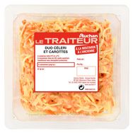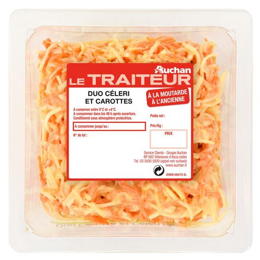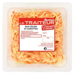 Ingrédients : Céleri râpé 43,2%, carotte râpée 31,2% , eau, huile de colza, jus d’orange concentré, ciboule, sucre, moutarde de Dijon