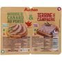 Ingrédients : Mousse de Canard : Gras de porc, foie maigre de canard 19%, graisse de canard 18%, foie de poulet, LAIT écrémé, couenne de porc, saindoux, Porto 2%, crème (LAIT), sel, sucre, farine de BLÉ, amidon de maïs, eau, arôme naturel, poivre, Armagnac, OEUFS en poudre, antioxydant : ascorbate de sodium protéines de LAIT, huile de paprika, conservateur : nitrite de sodium Elaboré à partir de canard, poulet et porc d'origine U.E.Pâté de campagne : Foie de porc, gorge de porc, gras de porc, eau, couenne de porc, farine de BLÉ, sel, oignons, OEUFS, sucre, ail, poivre, antioxydant: ascorbate de sodium colorant: caramel ordinaire conservateur : nitrite de sodium. Traces de lait.Elaboré à partir de porc origine France.