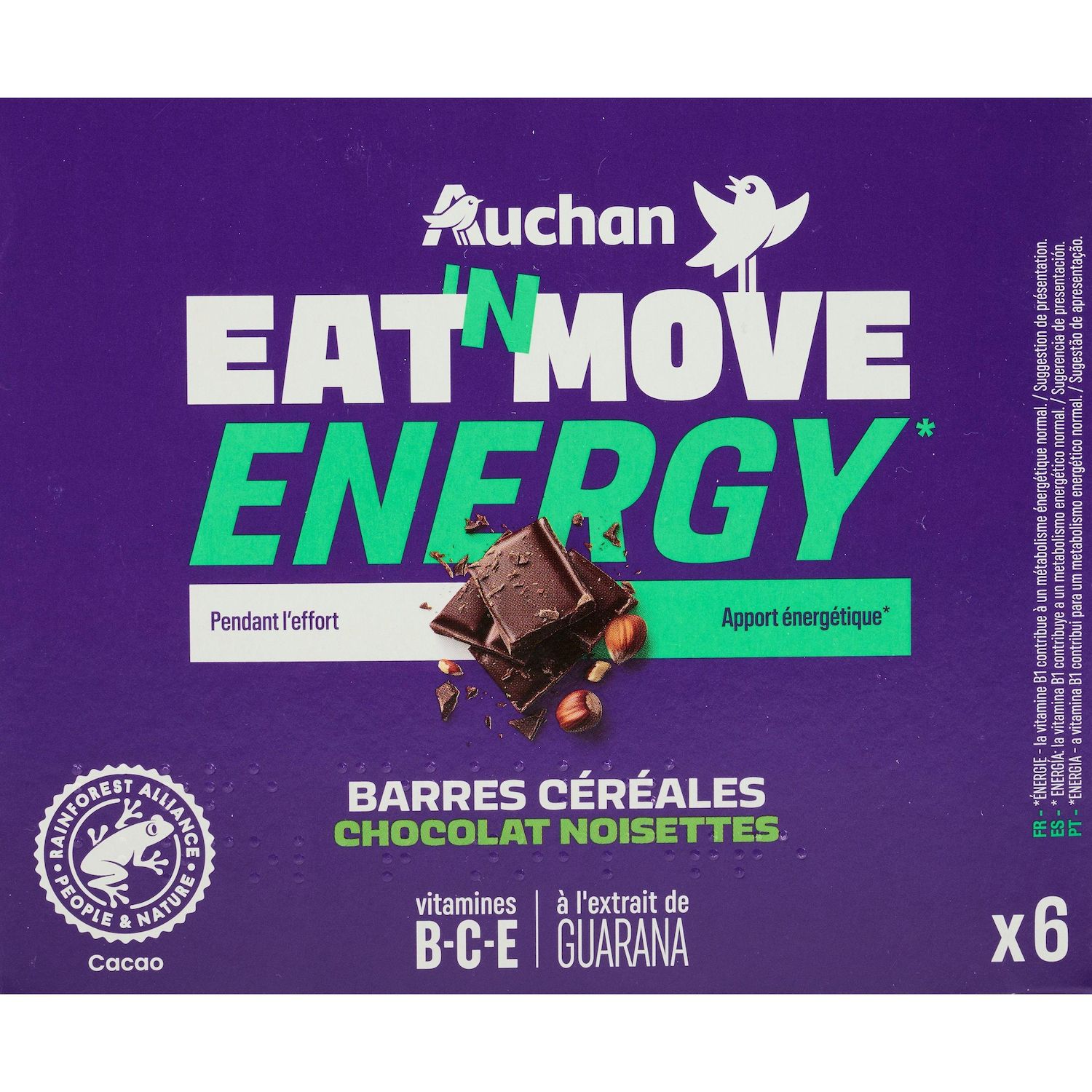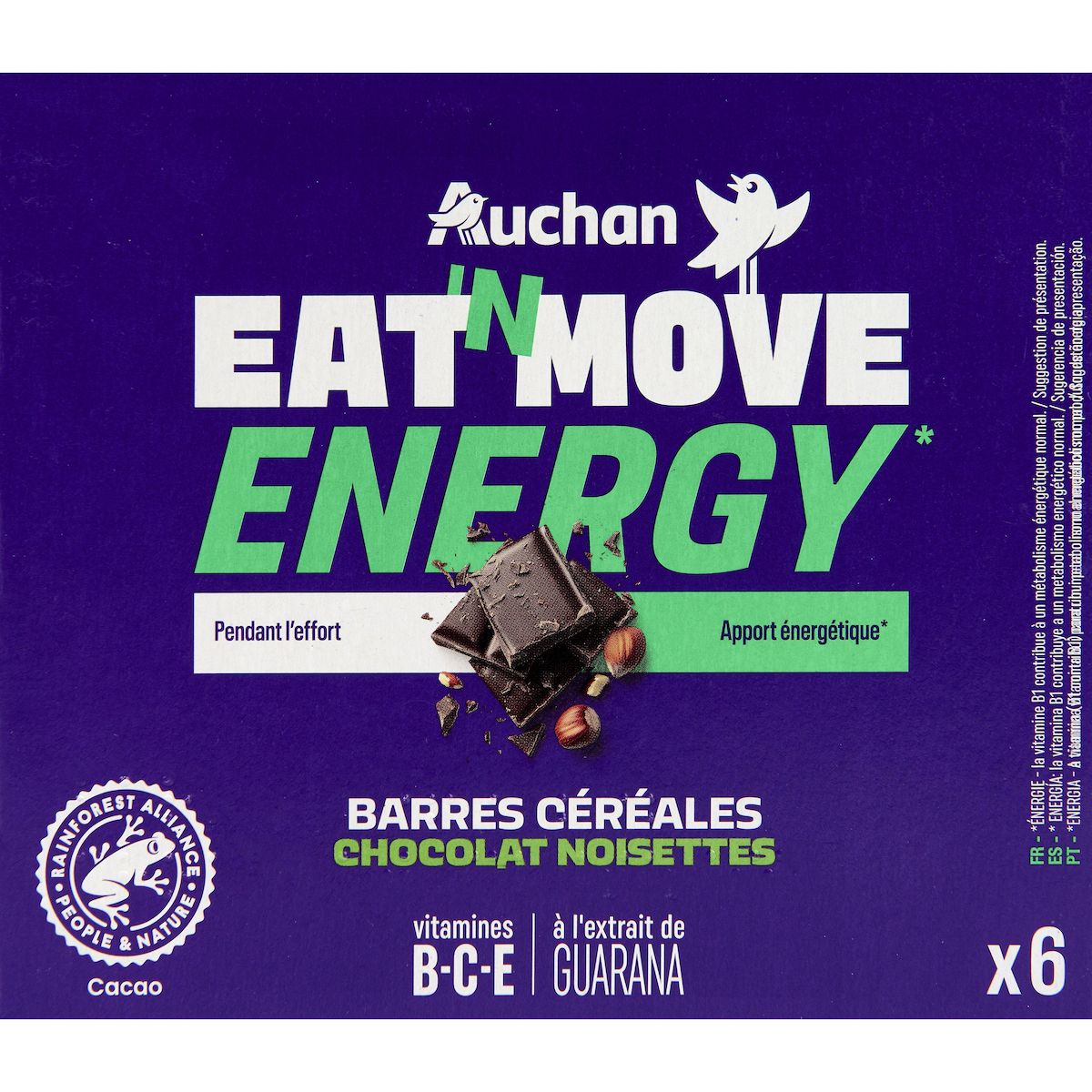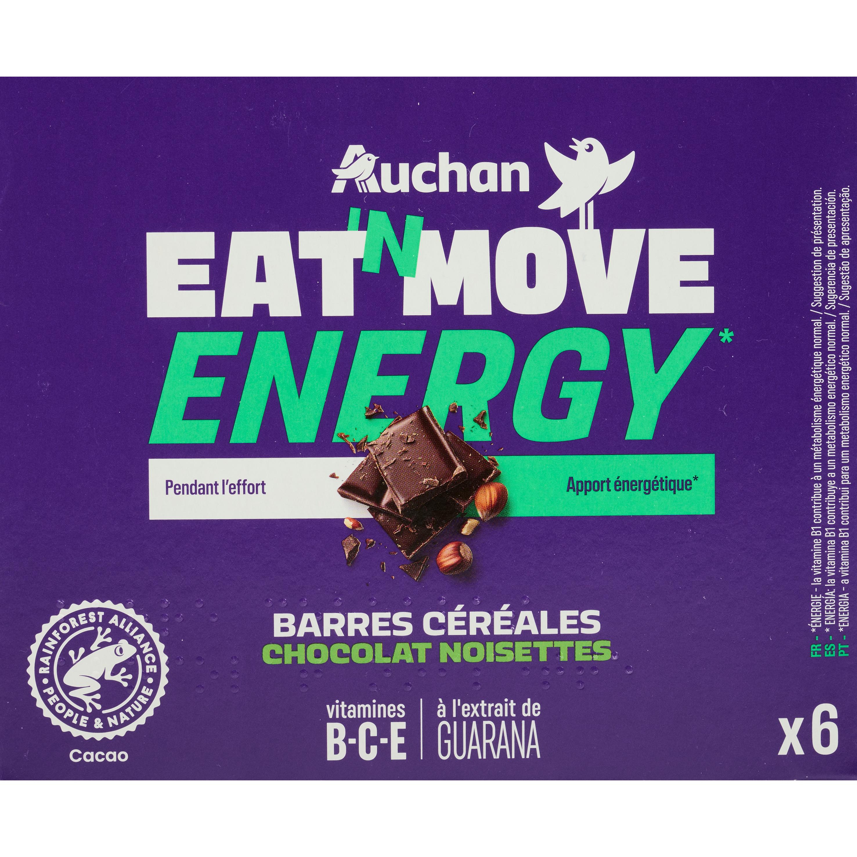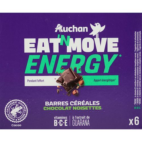 Barres céréalières de l'effort d'apport glucidique, au chocolat au lait, aux noisettes et au guarana, aromatisées. Source de vitamines.