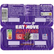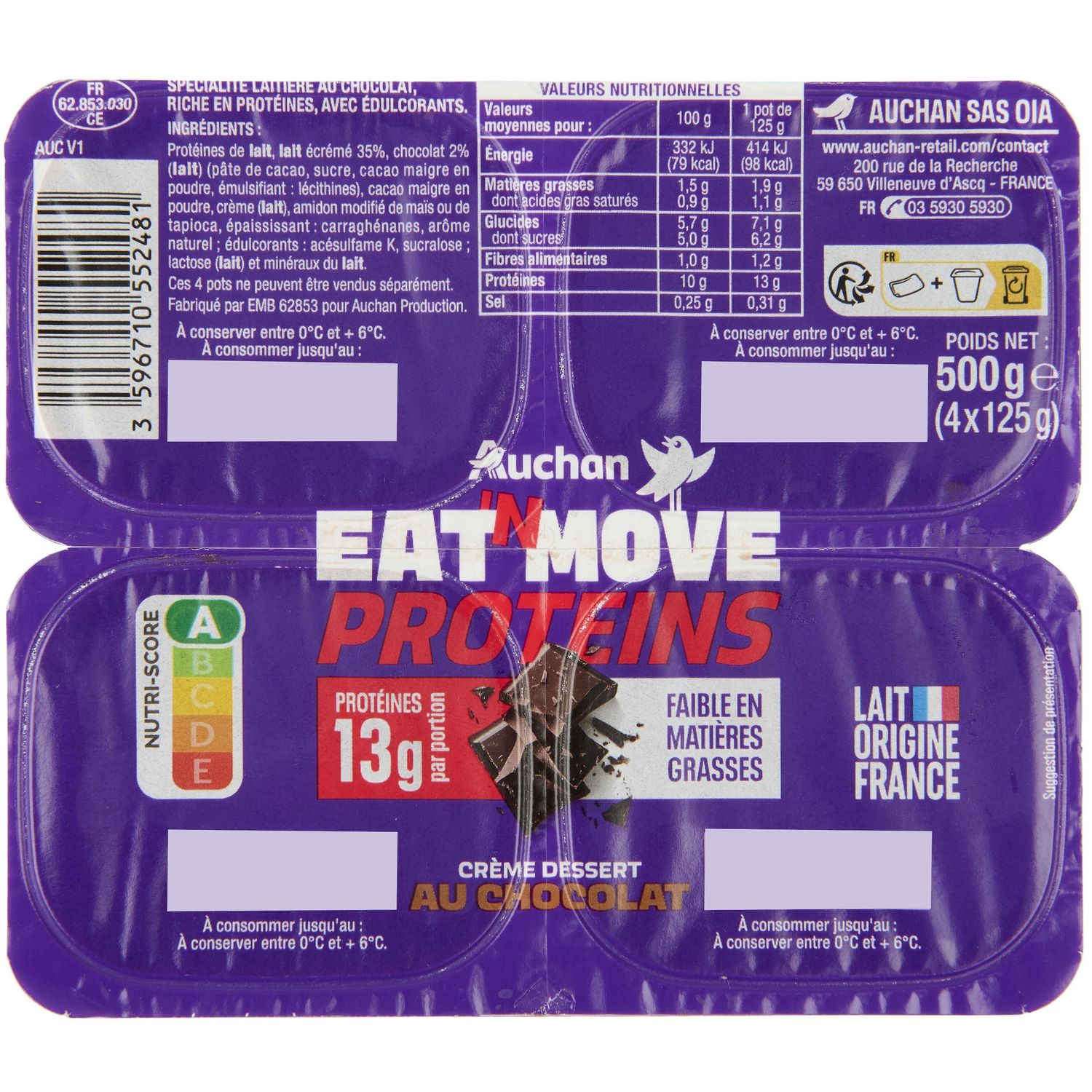 Ingrédients : Protéines de LAIT, LAIT écrémé 35%, chocolat 2% (LAIT) (pâte de cacao, sucre, cacao maigre en poudre, émulsifiant : lécithines), cacao maigre en poudre, crème (LAIT), amidon modifié de maïs ou de tapioca, épaississant : carraghénanes, arôme naturel, édulcorants : acésulfame K - sucralose, lactose (LAIT) et minéraux du LAIT. Elaboré à partir de lait origine France.
