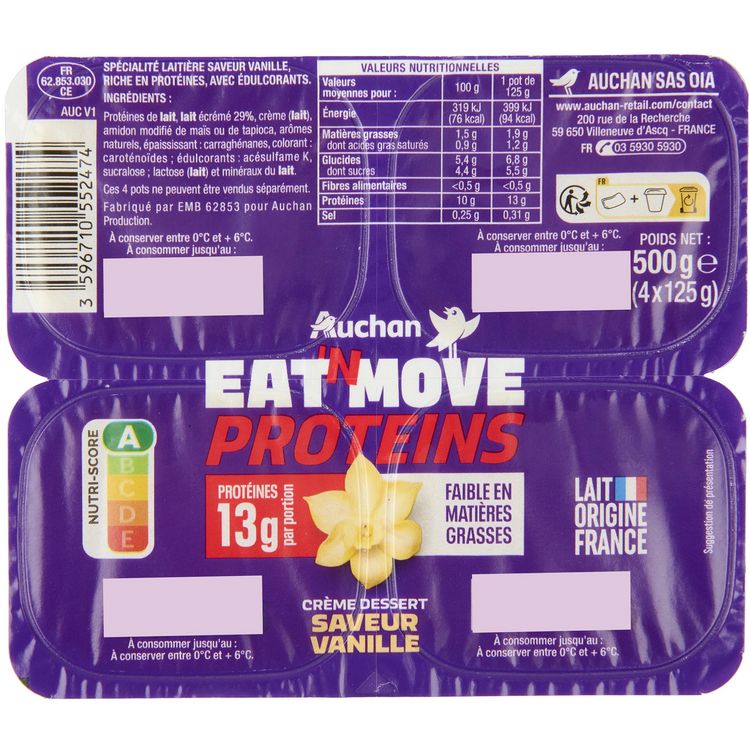 Ingrédients : Protéines de LAIT, LAIT écrémé 29%, crème (LAIT), amidon modifié de maïs ou de tapioca, arômes naturels, épaississant : carraghénanes, colorant : caroténoïdes, édulcorants : acésulfame K - sucralose, lactose (LAIT) et minéraux du LAIT. Elaboré à partir de lait origine France.