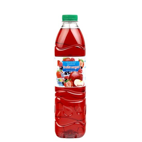 Ingrédients : Eau de source (92.1%), sucre, jus de fruits à base de concentrés 5% (pomme 2.5%, cassis 1.5%, fraise 0.5%, framboise 0.5%), acidifiant : acide citrique, arômes naturels, concentré de carotte pourpre.