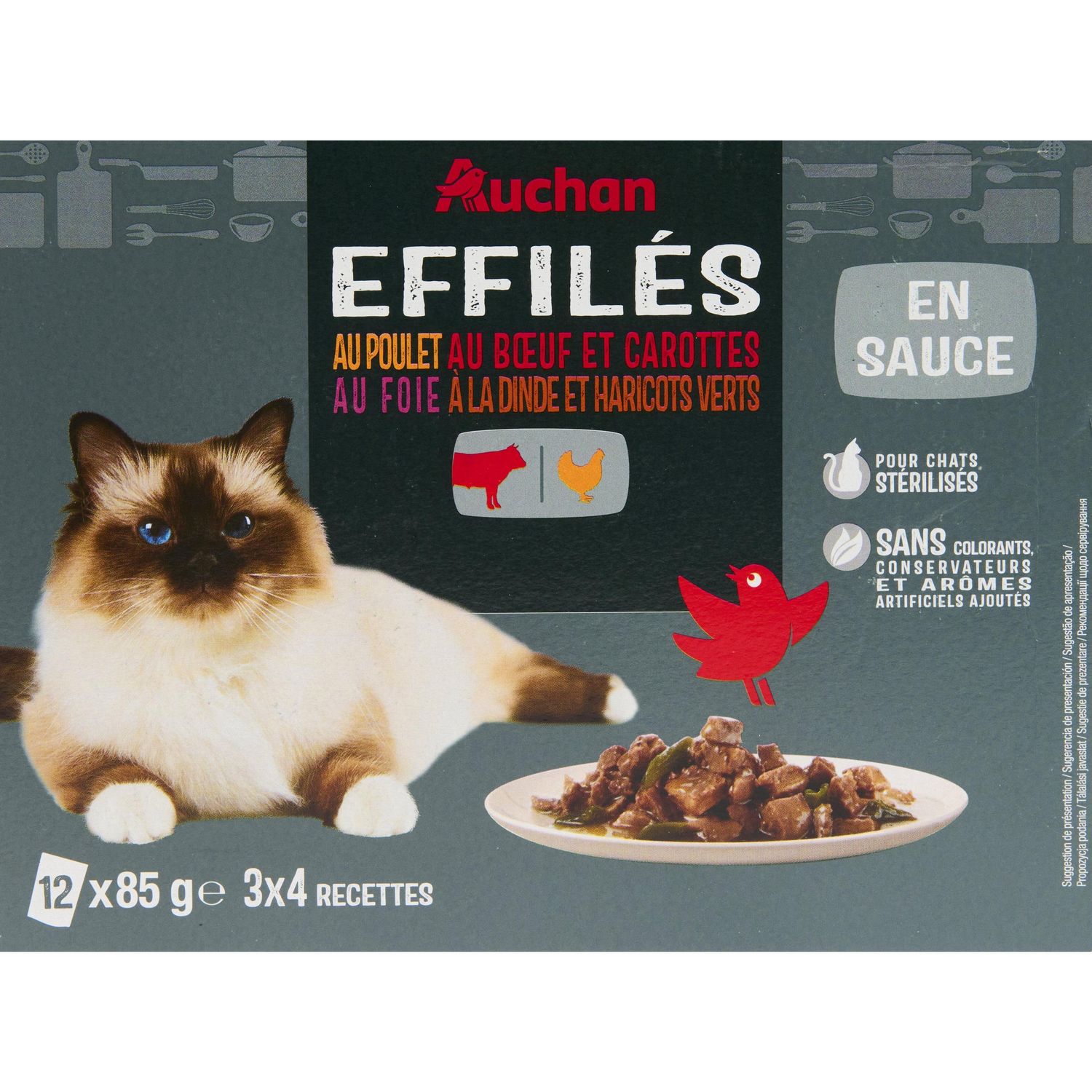 Effilés en sauce au poulet : Viandes et sous-produits animaux (dont poulet 4%), extrait de protéines végétales, sous-produits d'origine végétale (inuline de chicorée 0.4%), substances minérales, sucres.