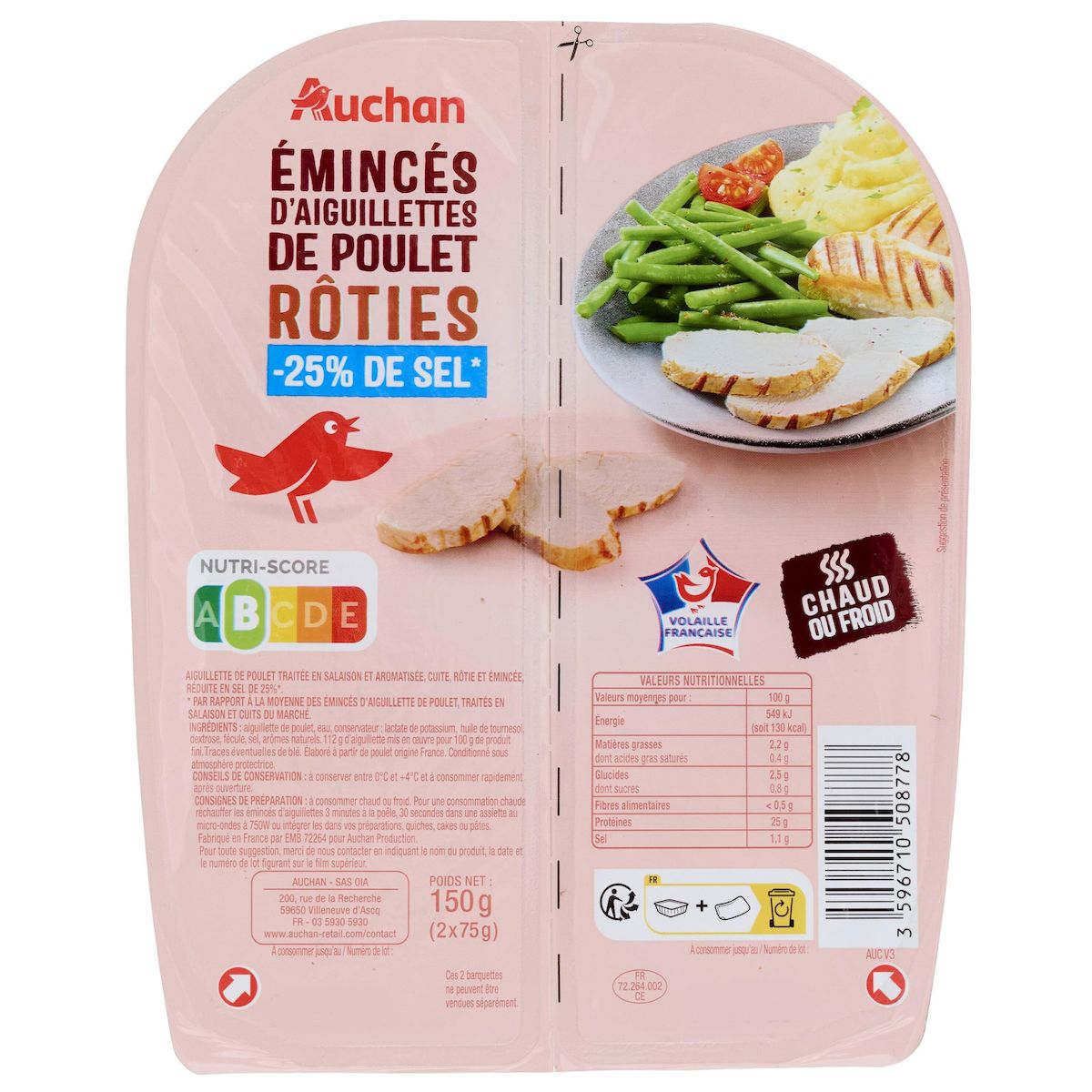 "Des émincés d'aiguilettes de poulet Rôti, moelleux et savoureux avec -25% de sel.Une barquette sécable pour une consommation à deux ou en plusieurs fois.Une découpe pratique pour agrémenter vos pâtes, vos quiches, vos salades, vos sandwichs."