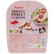 Ingrédients : Viande de cuisse de poulet, eau, huile de tournesol, conservateur : lactate de potassium , maltodextrine, sel, épices, poudre de tomate, poudre d’oignon, extrait de levure, arôme (dont arôme de fumée), extraits d’épices, poudre d’ail, poivron, persil, huile essentielle d’ail, protéine de soja, dextrose, gélifiant : carraghénanes. 114g de viande de cuisse de poulet mis en œuvre pour 100g de produit fini. Traces éventuelles de blé. Elaboré à partir de poulet origine France.