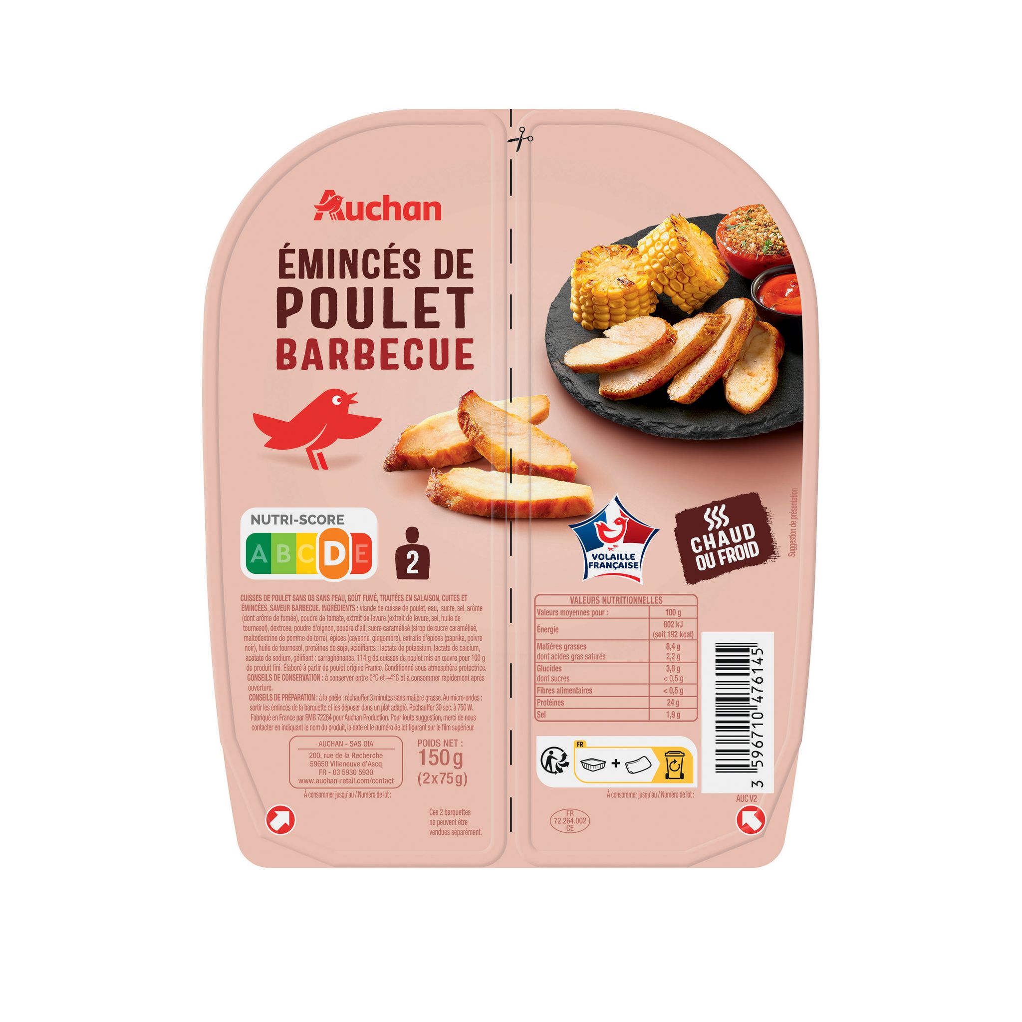 "Des émincés d'aiguillettes de poulet à la sauce Barbecue, moelleux et savoureux. Une barquette sécable pour une consommation à deux ou en plusieurs fois.Une découpe pratique pour agrémenter vos pâtes, vos quiches, vos salades, vos sandwichs. Une aide culinaires gourmande pour des repas faciles et rapides"