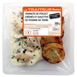 Ingrédients : Galettes de pommes de terre 30% [pommes de terre râpées, huile de tournesol, flocons de pomme de terre, oignon en poudre, sel, stabilisant : méthyl-cellulose, poivre], viande de poulet 27% (Origine : France), LAIT demi-écrémé, lardon cuit fumé 7,4% (poitrine de porc - origine : France, eau, sel, conservateur : nitrite de sodium), crème 6,2% (LAIT), emmental râpé 2,4% (LAIT), parmesan râpé 1,2% (LAIT), farine de tapioca, gélatine de boeuf, arôme naturel, sel, persil, eau, poivre.