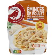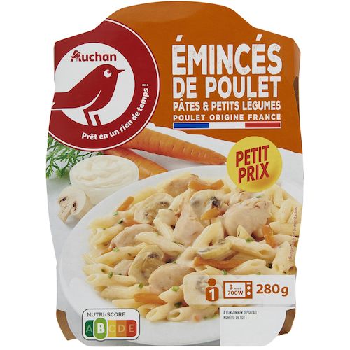 Ingrédients : Mini penne cuites 32,1% (eau, semoule de BLÉ dur, huile de tournesol ), eau, viande de poulet rôtie cuite traitée en salaison 16,8% (viande de poulet, eau, saumure (amidon de manioc, sel, dextrose), sirop de sucre caramélisé), crème fraîche légère 13,6% (LAIT) champignons de Paris et champignons de Paris déshydratés 11,6%, carottes 4,3%, farine de BLÉ, huile de tournesol, ciboulette, fond de volaille (viande et jus de cuisson de volaille, sel), sel, ail, poivre. Élaboré à partir de poulet et de lait origine France. Pourcentages exprimés sur le total de la recette. Traces éventuelles de céleri, oeufs, soja et moutarde.
