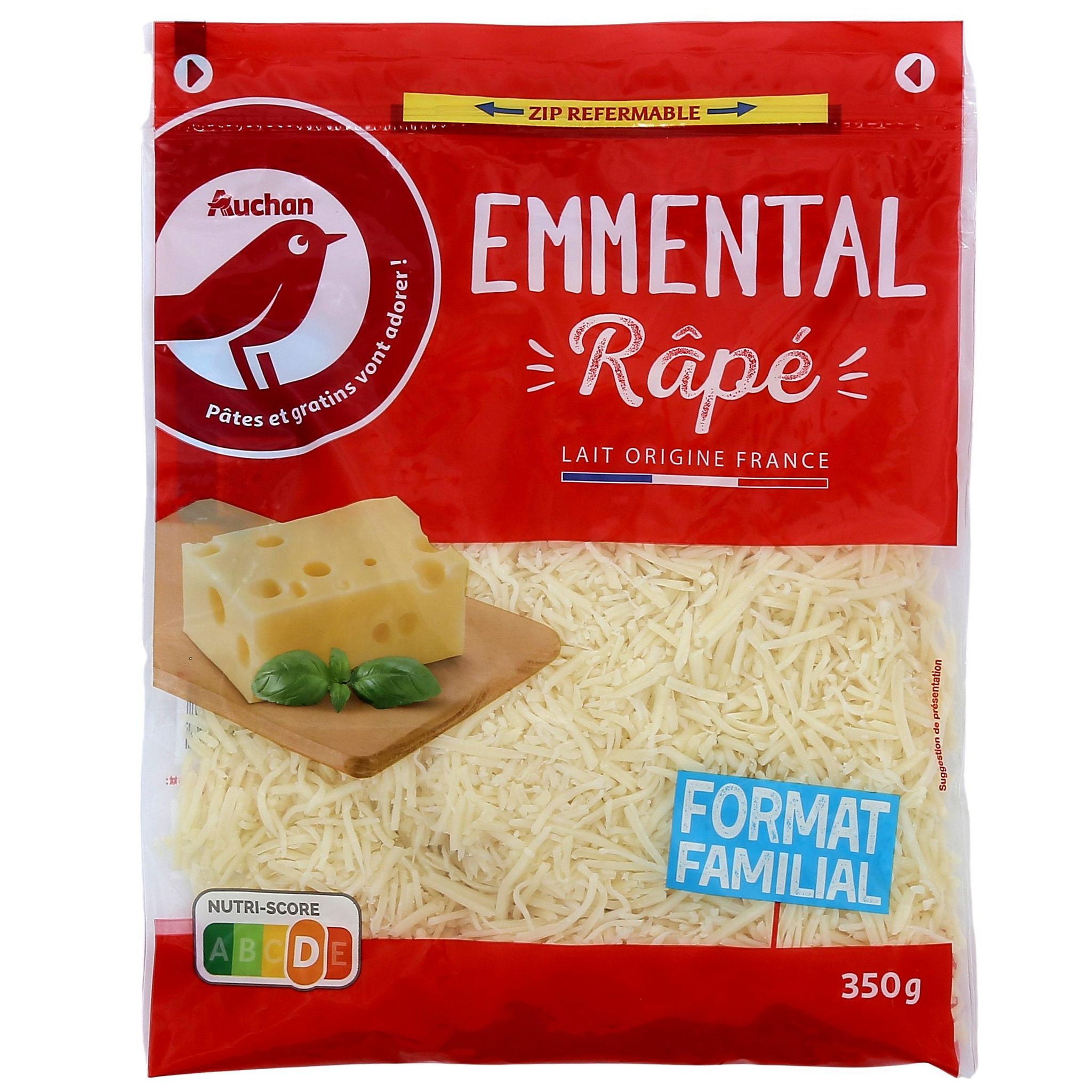 "Notre emmental râpé est un fromage à pâte pressée cuite, au lait pasteurisé, origine France. Son sachet est refermable pour conserver les saveurs même après ouverture."