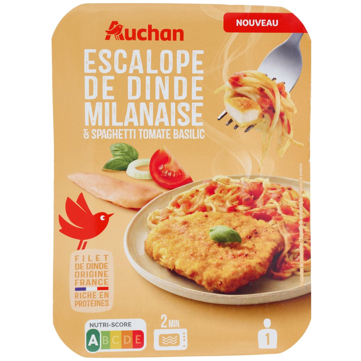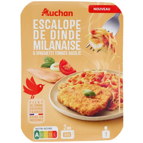 Ingrédients : Pané de dinde reconstitué traité en salaison, cuit 33,3% [filets de dinde reconstitués 24% (filets de dinde (origine : France), eau, sel, dextrose), panure (farine de BLÉ, sel, levures, épices (curcuma, paprika)), huile de tournesol], eau, pâte alimentaire spaghetti 13% (semoule de BLÉ dur, eau), tomate 6,3%, pulpe de tomate 6,3%, oignon, purée de tomates double concentrée 3,3%, huile de colza, amidon de riz, ail poudre déshydraté, basilic 0,5%, sucre, pulpe d'ail, sel, huile d'olive vierge extra, persil, origan, thym, poivre blanc. Traces éventuelles de lait.