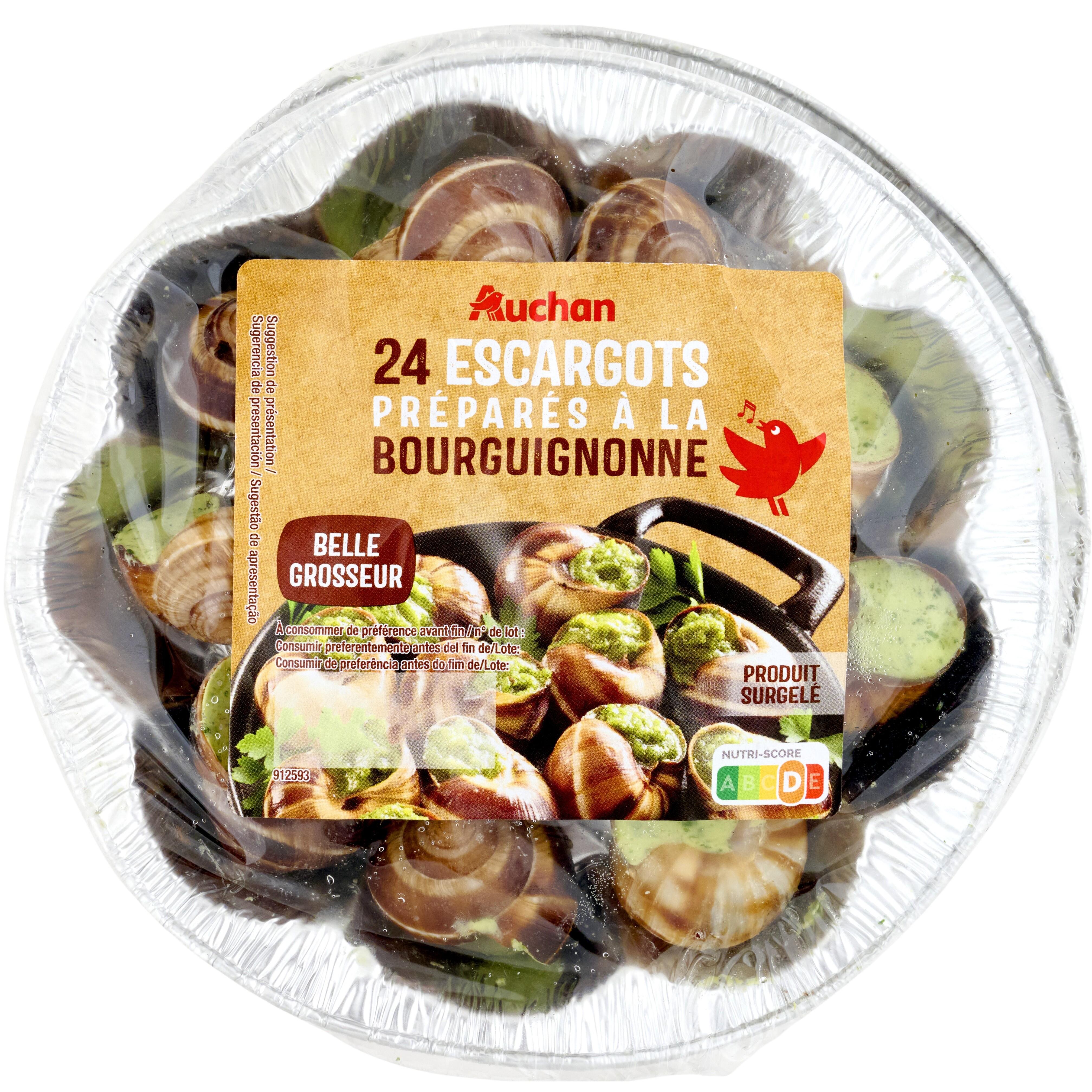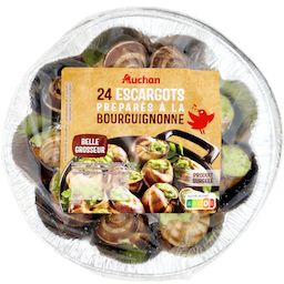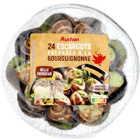 Ingrédients : Chairs d’escargots (MOLLUSQUE) Helix lucorum 50%, beurre (LAIT) 36%, ail réhydraté, persil 3,8%, échalote, sel, poivre, épices et plante aromatique (contient CÉLERI).Traces éventuelles de blé, poisson, crustacé, œuf, soja.