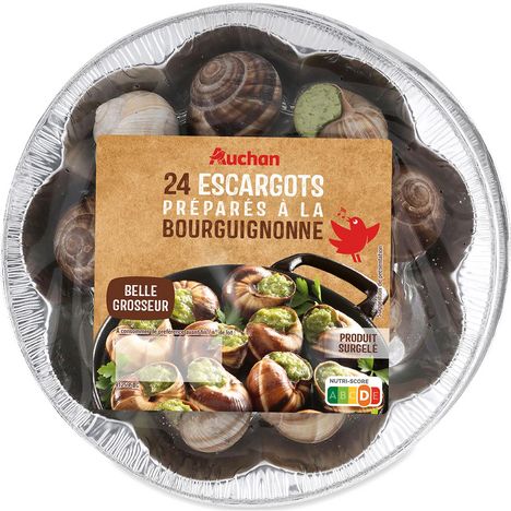 Ingrédients : Chairs d’escargots (MOLLUSQUE) Helix lucorum 50%, beurre (LAIT) 36%, ail réhydraté, persil 3,6%, échalote, sel, poivre, épices et plante aromatique (contient CÉLERI). Traces éventuelles de blé, poisson, crustacé, œuf, soja.