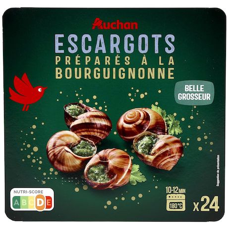 Ingrédients : Chairs d’escargots Helix lucorum (MOLLUSQUE) 50%, beurre (LAIT) 38%, ail 6,8%, persil 4,7%, sel, épices, plantes aromatiques (contient CÉLERI). Elaboré à partir de lait origine UE.