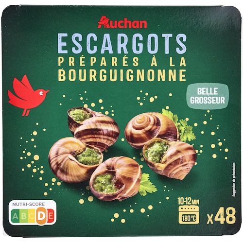 Ingrédients : Chairs d’escargots Helix lucorum (MOLLUSQUE) 50%, beurre (LAIT) 38%, ail 6,8%, persil 4,7%, sel, épices, plantes aromatiques (contient CÉLERI). Elaboré à partir de lait origine UE.
