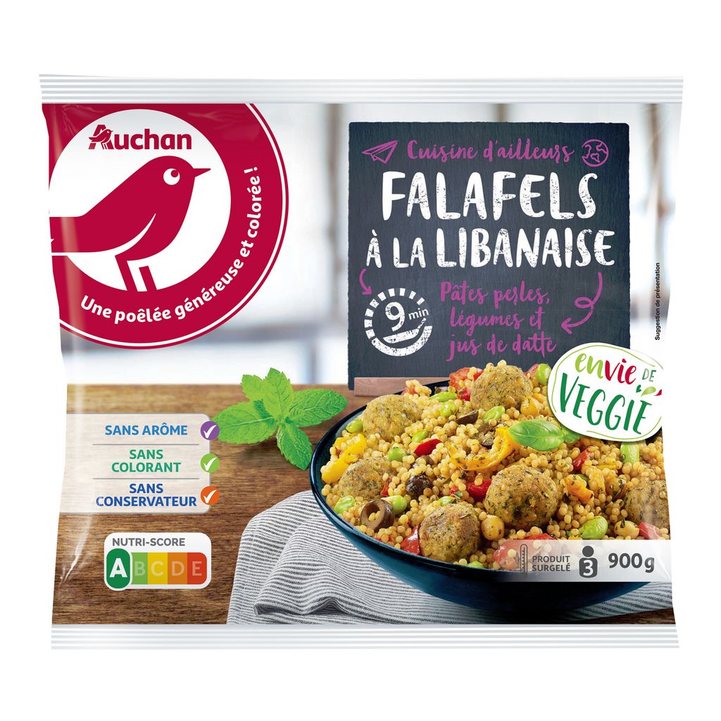 Pâtes perles cuites 41% (eau, semoule de blé dur, huile d'olive vierge extra, sel), falafels 16% (pois chiches, oignons, courgettes, carottes, plantes aromatiques, eau, huile de tournesol, farine de blé , sel, psyllium, vinaigre, dextrose, épices), pois chiches 7%, fève de soja 6%, eau, jus de datte 5%, poivron jaune 4%, poivron rouge 4%, huile d'olive vierge extra, olive noire 2% (olive, sel), vinaigre de Xérès, moutarde de Dijon (eau, graines de moutarde , vinaigre d'alcool, sel, acidifiant: acide citrique), sel, basilic, persil, menthe, coriandre, mélange d'épices raz el hanout 0.1% [curcuma, coriandre, paprika, cumin, poivre, gingembre, réglisse, cannelle, cardamome), sel, oignon, sucre], curcuma, cumin, poivre. Pourcentages exprimés sur le total de la recette.