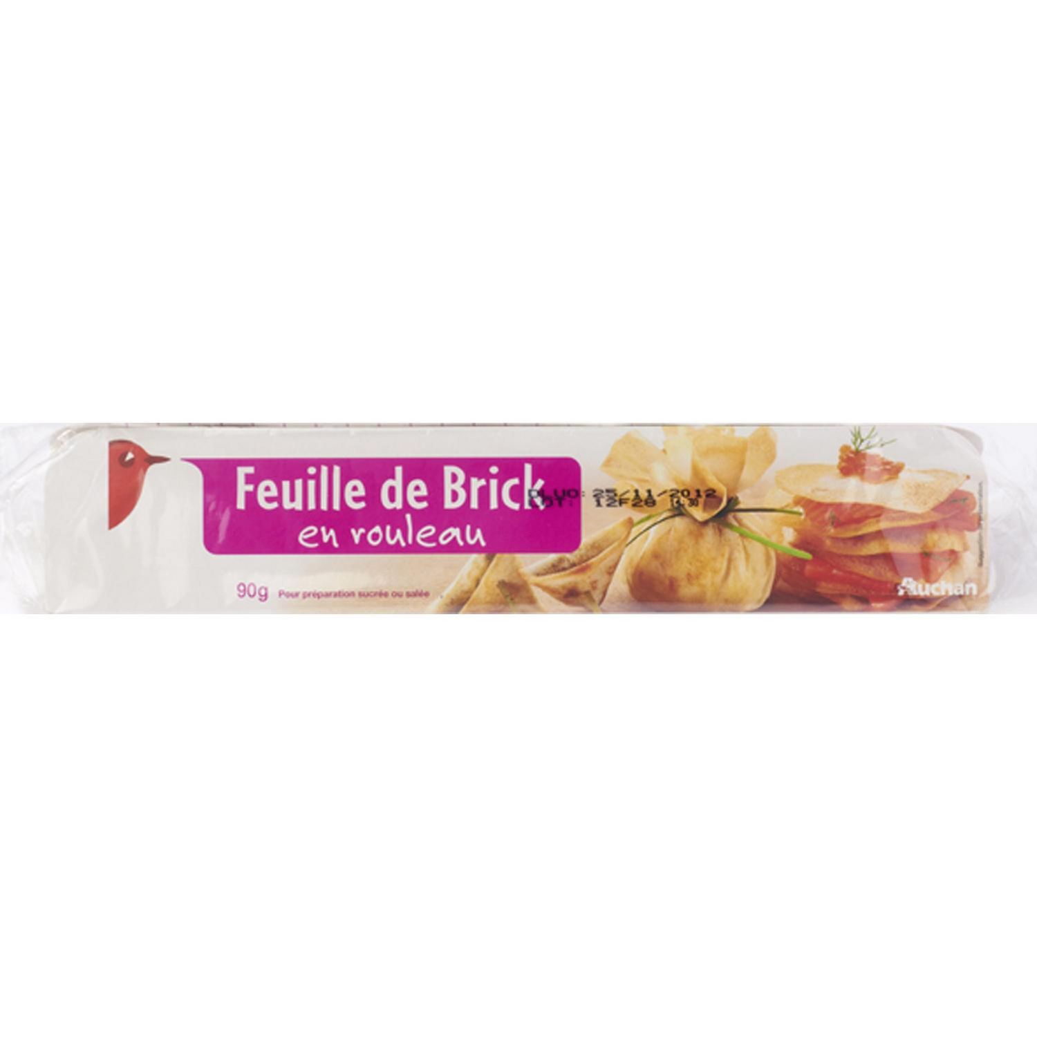 :Ne pas utiliser le papier paraffiné comme papier cuisson .astuces de pliage:voir pièces jointes : fiche pliage feuille de brick.cuisson:à la poêle : faire chauffer de l'huile ou du beurre dans une poêle, garnir les feuilles de bricks selon vos envies et faire cuire 2 à 3 minutes de chaque côté. en friture : Garnir les feuilles de brick, les plonger dans l'huile bien chaude et laisser cuire jusqu'à ce qu’elles prennent un aspect doré. au four : préchauffer le four à 220°C (Th. 7/8), garnir les feuilles de brick, les badigeonner de beurre fondu ou d'huile, enfourner et faire cuire 5 minutes jusqu'à ce qu’elles prennent un aspect doré..facile et pratique:Ces feuilles de brick sont faciles à cuisiner. En entrée, en plat ou en dessert, garnies de façon sucrée ou salée, vous pourrez surprendre vos invités. .suggestion recette salée:mille-feuilles au saumon et à l'anethpréparation : 10min. / Cuisson : 5min.Pour 6 mille-feuilles•1 rouleau de feuilles de brick Auchan•30g de beurre•6 tranches de saumon fumé•30 cl de crème fraîche épaisse•½ bouquet d'aneth•Sel, poivrePréparation :Découper 4 carrés de 10 cm de côté. Les badigeonner de beurre fondu et les passer au four jusqu'à ce qu'ils soient légèrement dorés. Les sortir et laisser refroidir.Couper en lamelles les tranches de saumon fumé. Mettre la crème fraîche dans un bol et l’assaisonner.Poser un carré de brick dans une assiette. Le garnir de saumon fumé. Le recouvrir d'un carré de brick lui-même garni d’un peu de crème fraîche. Refaire par dessus une couche au saumon fumé. Terminer par un carré de brick. Décorer de quelques brins d'aneth. Procéder à l’identique pour les autres mille-feuilles. Servir immédiatement..suggestion recette sucrée:aumonière de fruits rougespréparation : 10 min. / cuisson : 8 min.•1 rouleau de feuilles de brick Auchan découpé aux dimensions désirées•une poignée de fruits rouges•1 cuillère à soupe de crème fraîche épaisse (penser à l’alternative avec le mascarpone)•2 carrés de chocolat•1 cuillère à café de poudre d'amande•1/2 cuillère à soupe de sucre glaceDisposer tous les ingrédients au centre de la feuille de brick, en commençant par les fruits rouges, la crème fraîche (ou le mascarpone), la poudre d'amande, les carrés de chocolat et terminer par le sucre glace.Refermer soigneusement, et nouez au besoin avec un petit fil de corde de cuisson. Ne pas trop serrer pour ne pas abîmer la feuille de brick.Badigeonner délicatement au pinceau l'aumônière avec du beurre fondu et enfourner 8 minutes à 200°C (Th. 6/7).