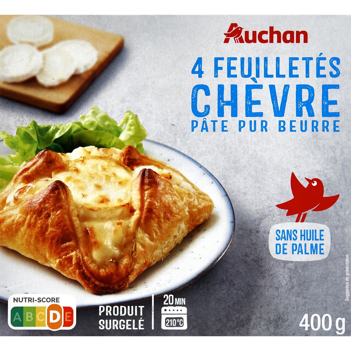 Ingrédients : Pâte feuilletée 50% (farine de BLÉ, eau, beurre (LAIT) 11% , sel, ŒUFS entiers), eau, tranche de fromage de chèvre affiné 15% (fromage de chèvre (LAIT de chèvre pasteurisé, sel, ferments LACTIQUES et fongiques, coagulant)), crème fraiche légère (LAIT) 5,3%, amidon modifié de pomme de terre, fromage de chèvre fondu 2% (fromage de chèvre (LAIT), eau, amidon modifié de pomme de terre, sel), beurre (LAIT), poudre de LAIT écrémé, amidon modifié de pomme de terre, lactose (LAIT), arôme naturel (LAIT), sel, protéines de LAIT, épaississant : méthylcellulose, amidon de pomme de terre, gélifiant : alginate de sodium.