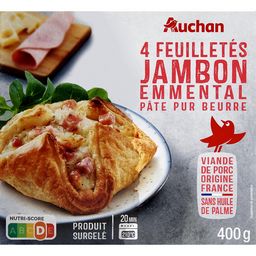 Pâte feuilleté crue garnie d'une préparation à base de jambon cuit standard aromatisé et d'emmental, surgelée