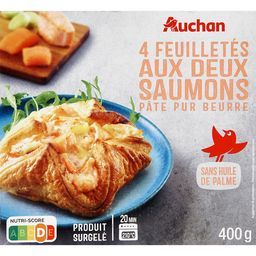 pâte feuilletée crue garnie d'une préparation à base de saumon, de saumon fumé et de légumes ,surgelée